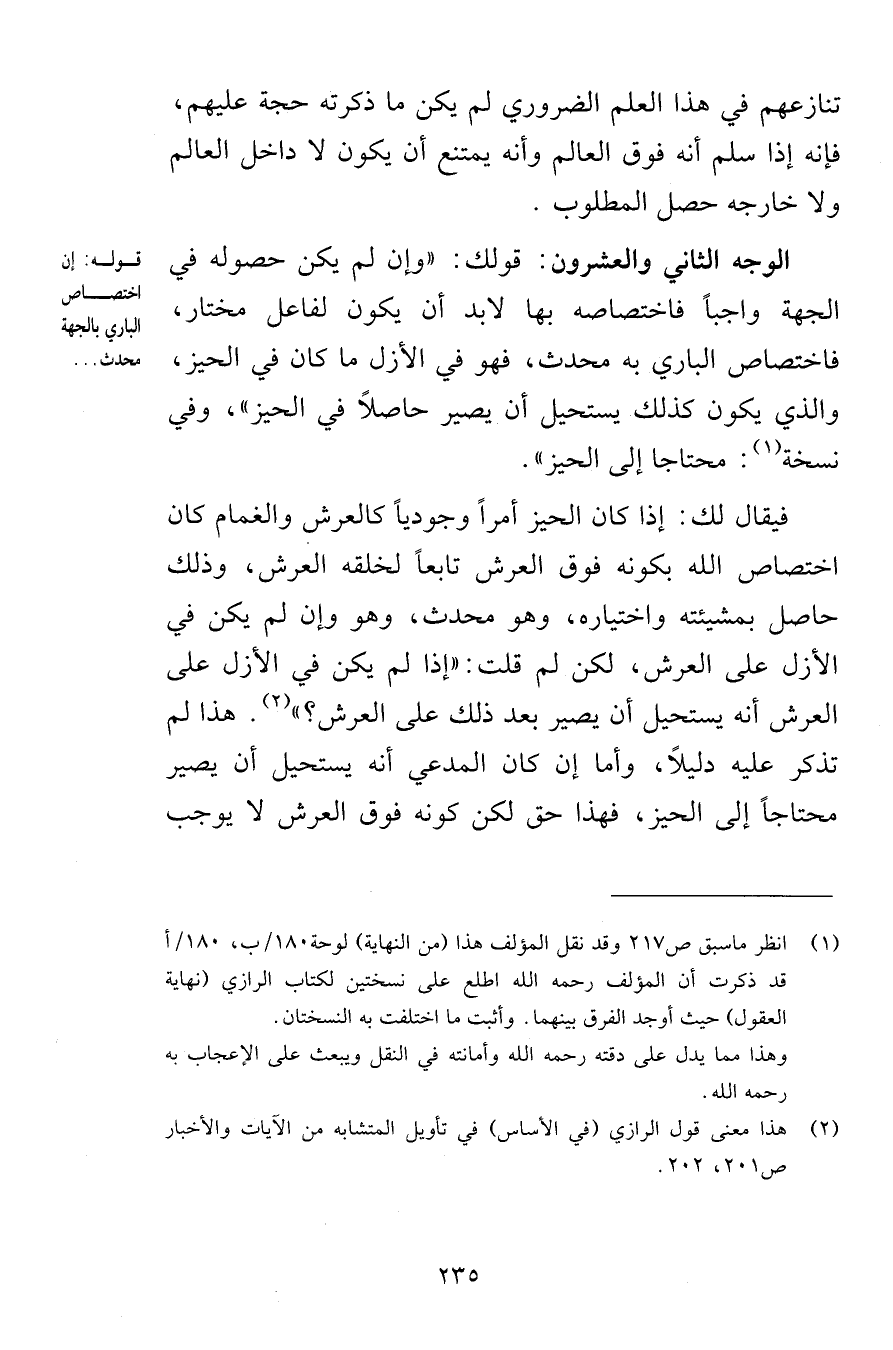 تنازعهم في هذا العلم الضروري لم يكن ما ذكرته حجة عليهم فإنه إذا سلم أنه فوق العالم وأنه يمتنع أن يكون لا داخل العالم ولا خارجه حصل المطلوب الوجه الثاني والعشرون قولك وإن لم يكن حصوله في الجهة واجباً فاختصاصه بها لابد أن يكون لفاعل مختار فاختصاص الباري به محدث فهو في الأزل ما كان في الحيز والذي يكون كذلك يستحيل أن يصير حاصلاً في الحيز وفي نسخة محتاجا إلى الحيز فيقال لك إذا كان الحيز أمراً وجودياً كالعرش والغمام كان اختصاص الله بكونه فوق العرش تابعاً لخلقه العرش وذلك حاصل بمشيئته واختياره وهو محدث وهو إن لم يكن في الأزل على العرش لكن لم قلت إذا لم يكن في الأزل على العرش أنه يستحيل أن يصير بعد ذلك على العرش هذا لم تذكر عليه دليلاً وأما إن كان المدعي أنه يستحيل أن يصير محتاجاً إلى الحيز فهذا حق لكن كونه فوق العرش لا يوجب