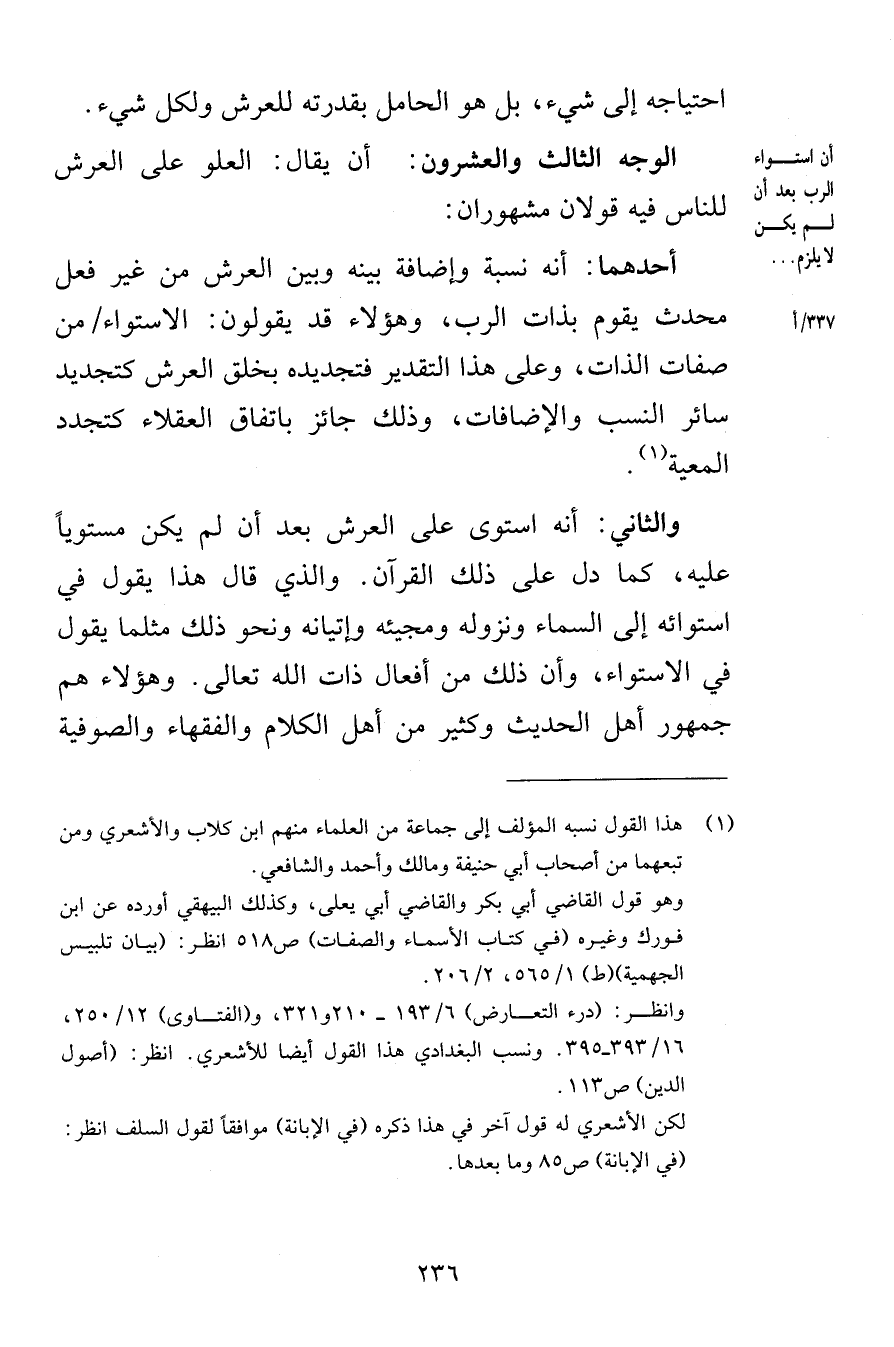 احتياجه إلى شيء بل هو الحامل بقدرته للعرش ولكل شيء الوجه الثالث والعشرون أن يقال العلو على العرش للناس فيه قولان مشهوران أحدهما أنه نسبة وإضافة بينه وبين العرش من غير فعل محدث يقوم بذات الرب وهؤلاء قد يقولون الاستواء من صفات الذات وعلى هذا التقدير فتجديده بخلق العرش كتجديد سائر النسب والإضافات وذلك جائز باتفاق العقلاء كتجدد المعية والثاني أنه استوى على العرش بعد أن لم يكن مستوياً عليه كما دل على ذلك القرآن والذي قال هذا يقول في استوائه إلى السماء ونزوله ومجيئه وإتيانه ونحو ذلك مثلما يقول في الاستواء وأن ذلك من أفعال ذات الله تعالى وهؤلاء هم جمهور أهل الحديث وكثير من أهل الكلام والفقهاء والصوفية