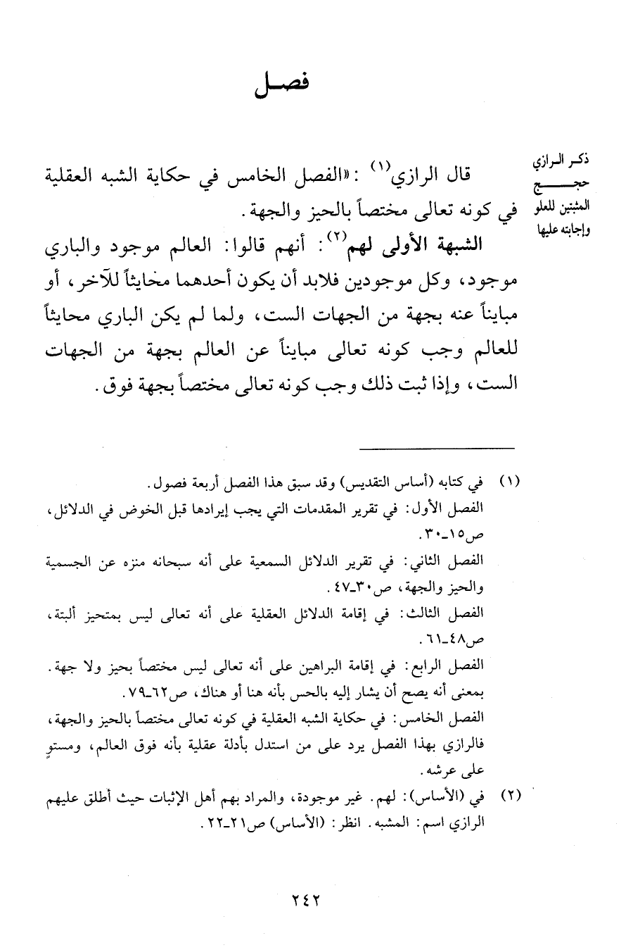 فصل قال الرازي الفصل الخامس في حكاية الشبه العقلية في كونه تعالى مختصاً بالحيز والجهة الشبهة الأولى لهم أنهم قالوا العالم موجود والباري موجود وكل موجودين فلابد أن يكون أحدهما محايثاً للآخر أو مبايناً عنه بجهة من الجهات الست ولما لم يكن الباري محايثاً للعالم وجب كونه تعالى مبايناً عن العالم بجهة من الجهات الست وإذا ثبت ذلك وجب كونه تعالى مختصاً بجهة الفوق