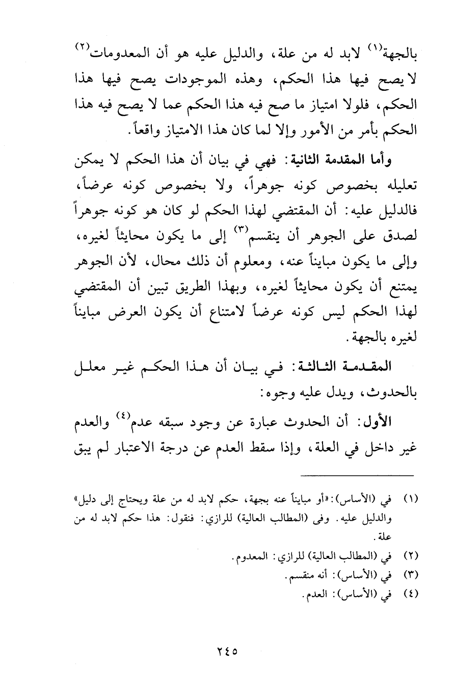 بالجهة لابد له من علة والدليل عليه هو أن المعدومات لا يصح فيها هذا الحكم وهذه الموجودات يصح فيها هذا الحكم فلولا امتياز ما صح فيه هذا الحكم عما لا يصح فيه هذا الحكم بأمر من الأمور وإلا لما كان هذا الامتياز واقعاً وأما المقدمة الثانية فهي في بيان أن هذا الحكم لا يمكن تعليله بخصوص كونه جوهراً ولا بخصوص كونه عرضاً فالدليل عليه أن المقتضي لهذا الحكم لو كان هو كونه جوهراً لصدق على الجوهر أن ينقسم إلى ما يكون محايثاً لغيره وإلى ما يكون مبايناً عنه ومعلوم أن ذلك محال لأن الجوهر يمتنع أن يكون محايثاً لغيره وبهذا الطريق تبين أن المقتضي لهذا الحكم ليس كونه عرضاً لامتناع أن يكون العرض مبايناً لغيره بالجهة المقدمة الثالثة في بيان أن هذا الحكم غير معلل بالحدوث ويدل عليه وجوه الأول أن الحدوث عبارة عن وجود سبقه عدم والعدم غير داخل في العلة وإذا سقط العدم عن درجة الاعتبار لم يبق