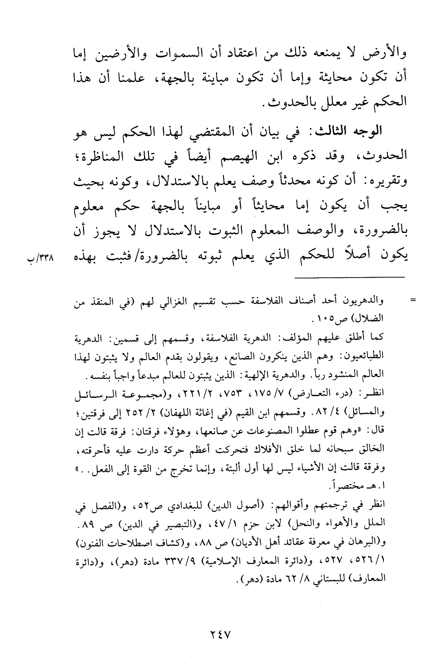 والأرض لا يمنعه ذلك من اعتقاد أن السموات والأرضين إما أن تكون محايثة وإما أن تكون مباينة بالجهة علمنا أن هذا الحكم غير معلل بالحدوث الوجه الثالث في بيان أن المقتضي هذا الحكم ليس هو الحدوث وقد ذكره ابن الهيصم أيضاً في تلك المناظرة وتقريره أن كونه محدثاً وصف يعلم بالاستدلال وكونه بحيث يجب أن يكون إما محايثاً أو مبايناً بالجهة حكم معلوم بالضرورة والوصف المعلوم الثبوت بالاستدلال لا يجوز أن يكون أصلاً للحكم الذي يعلم ثبوته بالضرورة فثبت بهذه
