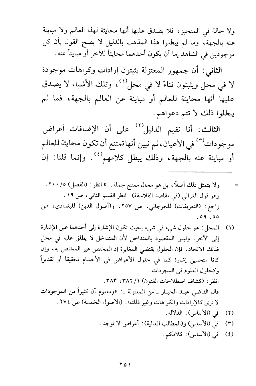 ولا حالة في المتحيز فلا يصدق عليها أنها محايثة لهذا العالم ولا مباينة عنه بالجهة وما لم يبطلوا هذا المذهب بالدليل لا يصح القول بأن كل موجودين في الشاهد إما أن يكون أحدهما محايثاً للآخر أو مبايناً عنه الثاني أن جمهور المعتزلة يثبتون إرادات وكراهات موجودة لا في محل ويثبتون فناءً لا في محل وتلك الأشياء لا يصدق عليها أنها محايثة للعالم أو مباينة عن العالم بالجهة فما لم يبطلوا ذلك لا تتم دعواهم الثالث أنا نقيم الدليل على أن الإضافات أعراض موجودات في الأعيان ثم نبين أنها تمتنع أن تكون محايثة للعالم أو مباينة عنه بالجهة وذلك يبطل كلامهم وإنما قلنا إن