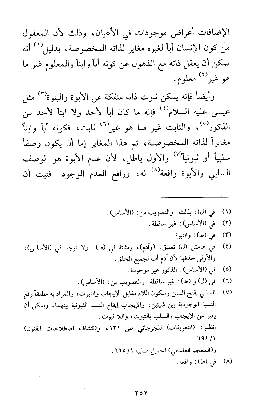 الإضافات أعراض موجودات في الأعيان وذلك لأن المعقول من كون الإنسان أباً لغيره مغاير لذاته المخصوصة بدليل أنه يمكن أن يعقل ذاته مع الذهول عن كونه أباً وابناً والمعلوم غير ما هو غير معلوم وأيضاً فإنه يمكن ثبوت ذاته منفكة عن الأبوة والبنوة مثل عيسى عليه السلام فإنه ما كان أباً لأحد ولا ابناً لأحد من الذكور والثابت غير ما هو غير ثابت فكونه أباً وابناً مغايراً لذاته المخصوصة ثم هذا المغاير إما أن يكون وصفاً سلبياً أو ثبوتياً والأول باطل لأن عدم الأبوة هو الوصف السلبي والأبوة رافعة له ورافع العدم الوجود فثبت أن