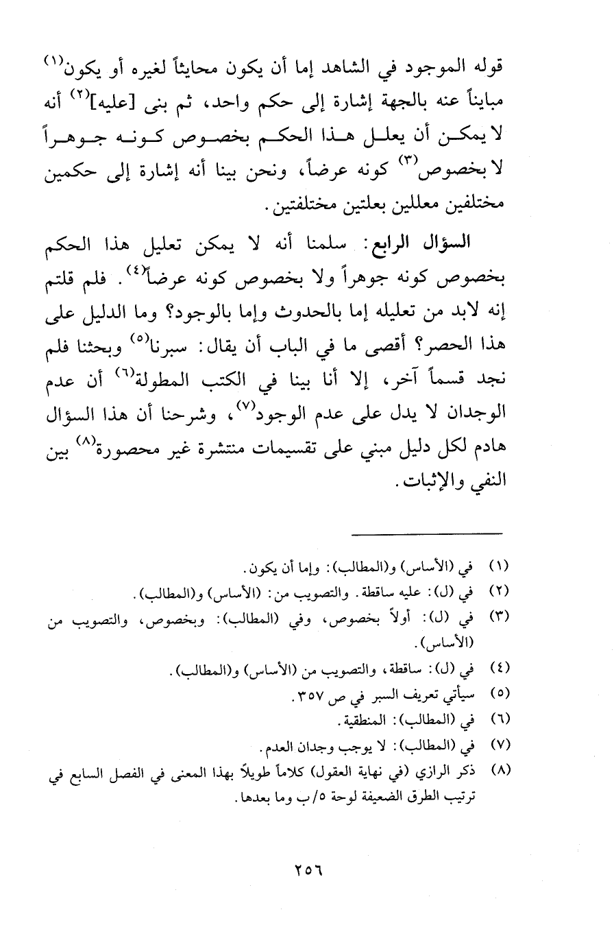 قوله الموجود في الشاهد إما أن يكون محايثاً لغيره أو يكون مبايناً عنه بالجهة إشارة إلى حكم واحد ثم بنى عليه أنه لا يمكن أن يعلل هذا الحكم بخصوص كونه جوهراً لا بخصوص كونه عرضاً ونحن بينا أنه إشارة إلى حكمين مختلفين معللين بعلتين مختلفتين السؤال الرابع سلمنا أنه لا يمكن تعليل هذا الحكم بخصوص كونه جوهراً ولا بخصوص كونه عرضاً فلم قلتم إنه لابد من تعليله إما بالحدوث وإما بالوجود وما الدليل على هذا الحصر أقصى ما في الباب أن يقال سبرنا وبحثنا فلم نجد قسماً آخر إلا أنا بينا في الكتب المطولة أن عدم الوجدان لا يدل على عدم الوجود وشرحنا أن هذا السؤال هادم لكل دليل مبني على تقسيمات منتشرة غير محصورة بين النفي والإثبات