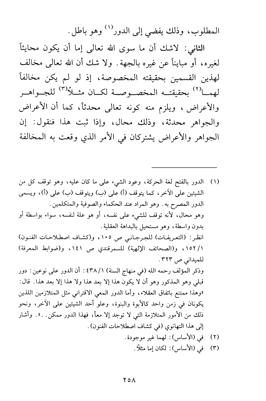 المطلوب وذلك يفضي إلى الدور وهو باطل الثاني لاشك أن ما سوى الله تعالى إما أن يكون محايثاً لغيره أو مبايناً عن غيره بالجهة ولا شك أن الله تعالى مخالف لهذين القسمين بحقيقته المخصوصة إذ لو لم يكن مخالفاً لهما بحقيقته المخصوصة لكان مثلاً للجواهر والأعراض ويلزم منه كونه تعالى محدثاً كما أن الأعراض والجواهر محدثة وذلك محال وإذا ثبت هذا فنقول إن الجواهر والأعراض يشتركان في الأمر الذي وقعت به المخالفة