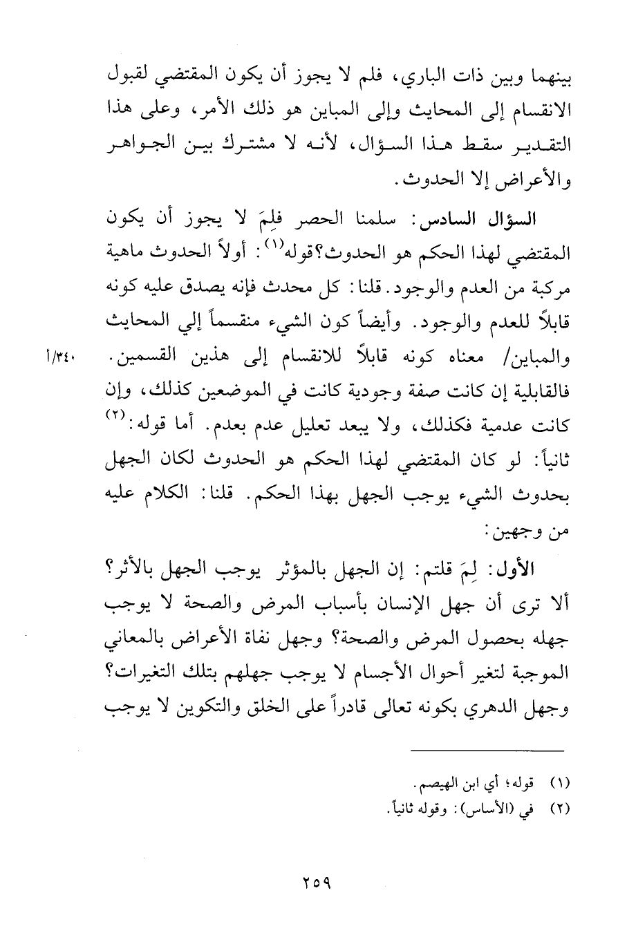 بينهما وبين ذات الباري فلم لا يجوز أن يكون المقتضي لقبول الانقسام إلى المحايث وإلى المباين هو ذلك الأمر وعلى هذا التقدير سقط هذا السؤال لأنه لا مشترك بين الجواهر والأعراض إلا الحدوث السؤال السادس سلمنا الحصر فلِمَ لا يجوز أن يكون المقتضي لهذا الحكم هو الحدوث قوله أولاً الحدوث ماهية مركبة من العدم والوجود قلنا كل محدث فإنه يصدق عليه كونه قابلاً للعدم والوجود وأيضاً كون الشيء منقسماً إلى المحايث والمباين معناه كونه قابلاً للانقسام إلى هذين القسمين فالقابلية إن كانت صفة وجودية كانت في الموضعين كذلك وإن كانت عدمية فكذلك ولا يبعد تعليل عدم بعدم أما قوله ثانياً لو كان المقتضي لهذا الحكم هو الحدوث لكان الجهل بحدوث الشيء يوجب الجهل بهذا الحكم قلنا الكلام عليه من وجهين الأول لِمَ قلتم إن الجهل بالمؤثر يوجب الجهل بالأثر ألا ترى أن جهل الإنسان بأسباب المرض والصحة وجهل نفاة الأعراض بالمعاني الموجبة لتغير أحوال الأجسام لا يوجب جهلهم بتلك التغيرات وجهل الدهري بكونه تعالى قادراً على الخلق والتكوين لا يوجب