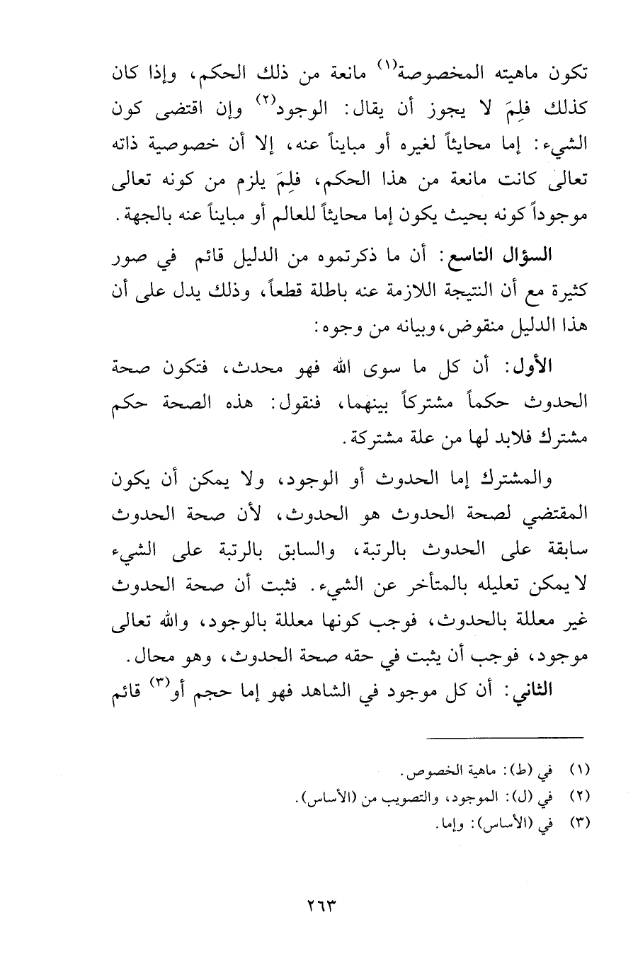 تكون ماهيته المخصوصة مانعة من ذلك الحكم وإذا كان كذلك فلِمَ لا يجوز أن يقال الوجود وإن اقتضى كون الشيء إما محايثاً لغيره أو مبايناً عنه إلا أن خصوصية ذاته تعالى كانت مانعة من هذا الحكم فلِمَ يلزم من كونه تعالى موجوداً كونه بحيث يكون إما محايثاً للعالم أو مبايناً عنه بالجهة السؤال التاسع أن ما ذكرتموه من الدليل قائم في صور كثيرة مع أن النتيجة اللازمة عنه باطلة قطعاً وذلك يدل على أن هذا الدليل منقوض وبيانه من وجوه الأول أن كل ما سوى الله فهو محدث فتكون صحة الحدوث حكماً مشتركاً بينهما فنقول هذه الصحة حكم مشترك فلابد لها من علة مشتركة والمشترك إما الحدوث أو الوجود ولا يمكن أن يكون المقتضي لصحة الحدوث هو الحدوث لأن صحة الحدوث سابقة على الحدوث بالرتبة والسابق بالرتبة على الشيء لا يمكن تعليله بالمتأخر عن الشيء فثبت أن صحة الحدوث غير معللة بالحدوث فوجب كونها معللة بالوجود والله تعالى موجود فوجب أن يثبت في حقه صحة الحدوث وهو محال الثاني أن كل موجود في الشاهد فهو إما حجم أو قائم