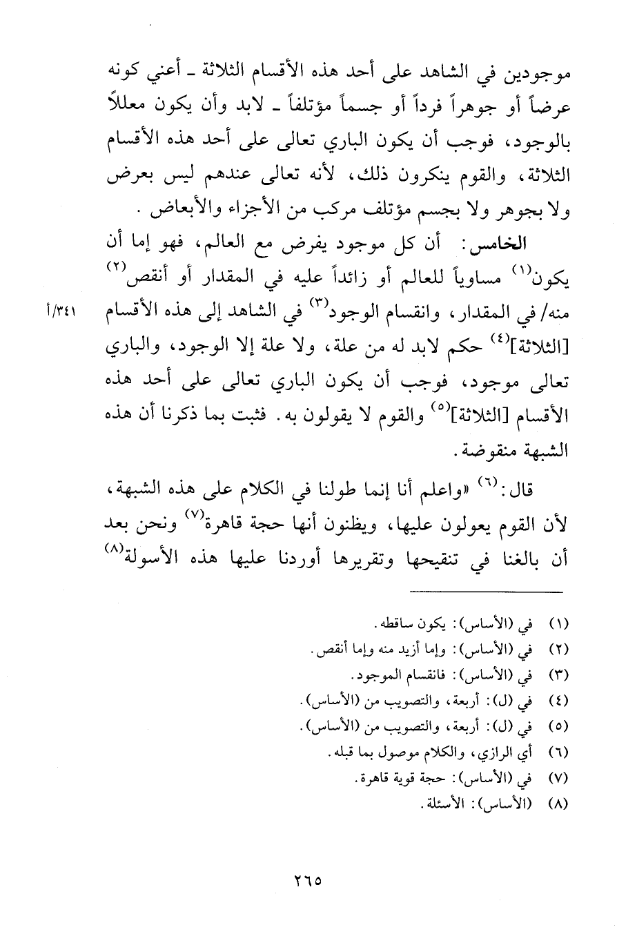 موجودين في الشاهد على أحد هذه الأقسام الثلاثة أعني كونه عرضاً أو جوهراً فرداً أو جسماً مؤتلفاً لابد وأن يكون معللاً بالوجود فوجب أن يكون الباري تعالى على أحد هذه الأقسام الثلاثة والقوم ينكرون ذلك لأنه تعالى عندهم ليس بغرض ولا بجوهر ولا بجسم مؤتلف مركب من الأجزاء والأبعاض الخامس أن كل موجود يفرض مع العالم فهو إما أن يكون مساوياً للعالم أو زائداً عليه في المقدار أو أنقص منه في المقدار وانقسام الوجود في الشاهد إلى هذه الأقسام الثلاثة حكم لابد له من علة ولا علة إلا بالوجود والباري تعالى موجود فوجب أن يكون الباري تعالى على أحد هذه الأقسام الثلاثة والقوم لا يقولون به فثبت بما ذكرنا أن هذه الشبهة منقوضة قال واعلم أنا إنما طولنا في الكلام على هذه الشبهة لأن القوم يعولون عليها ويظنون أنها حجة قاهرة ونحن بعد أن بالغنا في تنقيحها وتقريرها أوردنا عليها هذه الأسولة