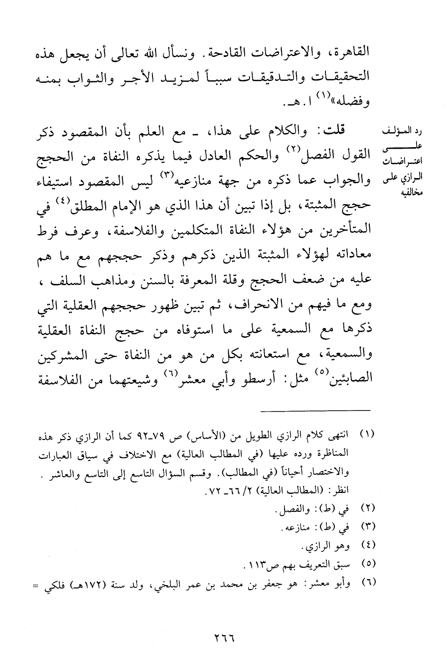 القاهرة والاعتراضات القادحة ونسأل الله تعالى أن يجعل هذه التحقيقات والتدقيقات سبباً لمزيد الأجر والثواب بمنه وفضله اهـ قلت والكلام على هذا مع العلم بأن المقصود ذكر القول الفصل والحكم العادل فيما يذكره النفاة من الحجج والجواب عما ذكره من جهة منازعيه ليس المقصود استيفاء حجج المثبتة بل إذا تبين أن هذا الذي هو الإمام المطلق في المتأخرين من هؤلاء النفاة المتكلمين والفلاسفة وعرف فرط معاداته لهؤلاء المثبتة الذين ذكرهم وذكر حججهم مع ما هم عليه من ضعف الحجج وقلة المعرفة بالسنن ومذاهب السلف ومع ما فيهم من الانحراف ثم تبين ظهور حججهم العقلية التي ذكرها مع السمعية على ما استوفاه من حجج النفاة العقلية والسمعية مع استعانته بكل من هو من النفاة حتى المشركين الصابئين مثل أرسطو وأبي معشر وشيعتهما من الفلاسفة