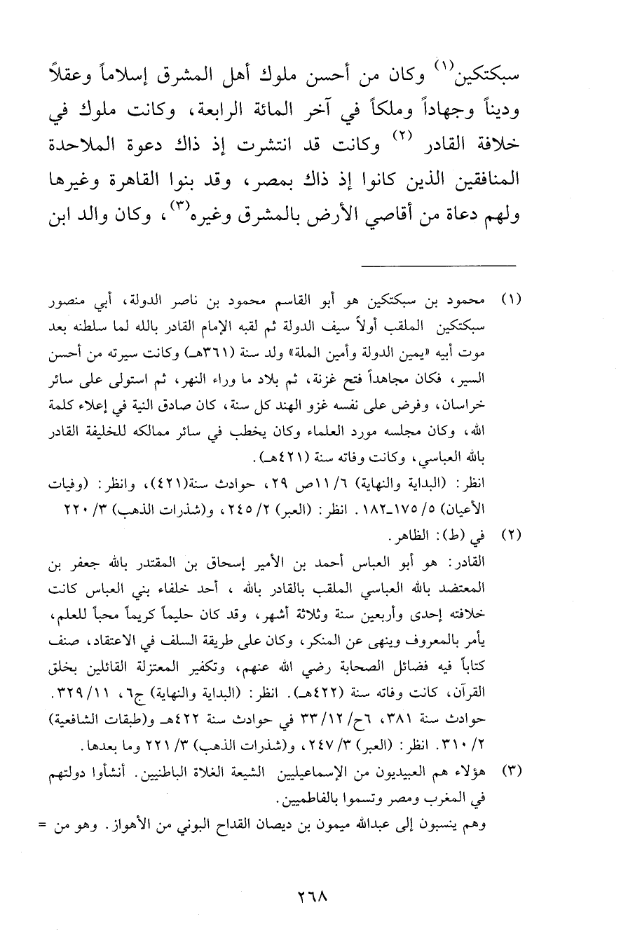 سبكتكين وكان من أحسن ملوك أهل المشرق إسلاما ً وعقلاً وديناً وجهاداً وملكاً في آخر المائة الرابعة وكانت ملوك في خلافة القادر وكانت قد انتشرت إذ ذاك دعوة الملاحدة المنافقين الذين كانوا إذ ذاك بمصر وفد بنوا القاهرة وغيرها ولهم دعاة من أقاصي الأرض بالمشرق وغيره وكان والد ابن