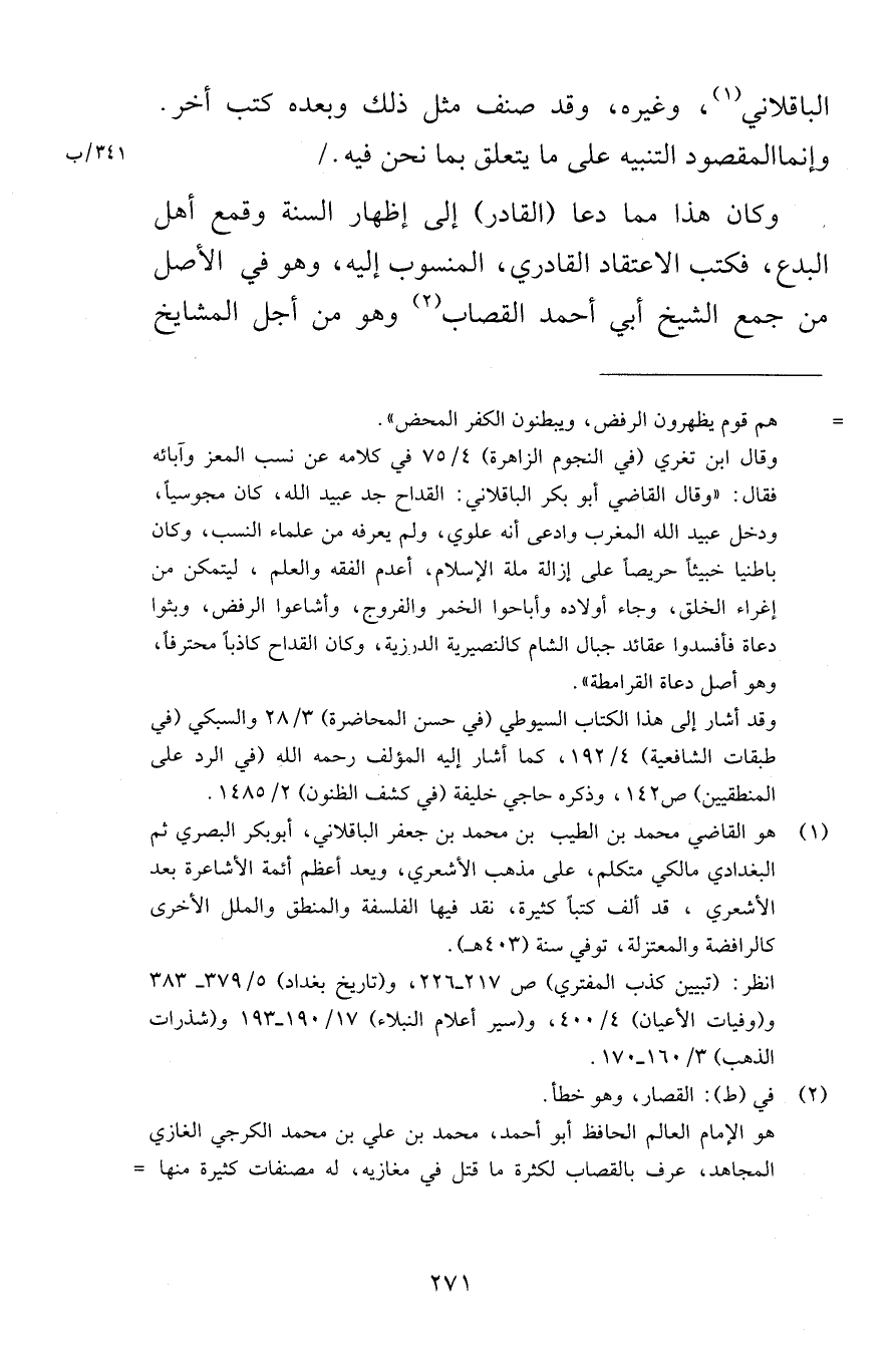 الباقلاني وغيره وقد صنف مثل ذلك وبعضه كتب أخر وإنماالمقصود التنبيه على ما يتعلق بما نحن فيه وكان هذا مما دعا القادر إلى إظهار السنة وقمع أهل البدع فكتب الاعتقاد القادري المنسوب إليه وهو في الأصل من جمع الشيخ أبي أحمد القصاب وهو من أجل المشايخ