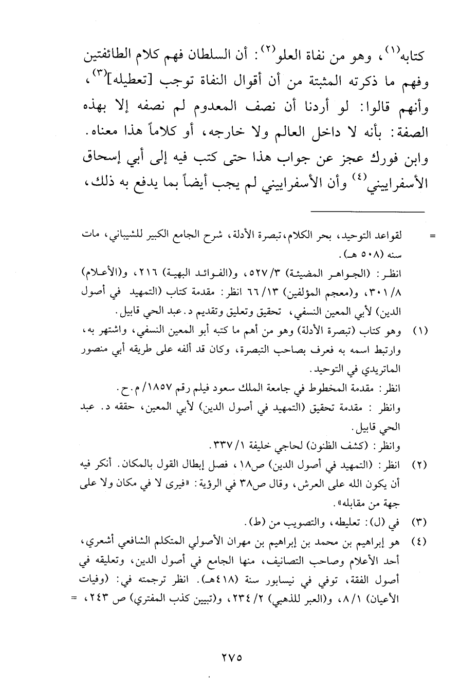 كتابه وهو من نفاة العلو أن السلطان فهم كلام الطائفتين وفهم ما ذكرته المثبتة من أن أقوال النفاة توجب تعطيله وأنهم قالوا لو أردنا أن نصف المعدوم لم نصفه إلا بهذه الصفة بأنه لا داخل العالم ولا خارجه أو كلاماً هذا معناه وابن فورك عجز عن جواب هذا حتى كتب فيه على أبي إسحاق الأسفراييني وأن الأسفراييني لم يجب أيضاً بما يدفع به ذلك