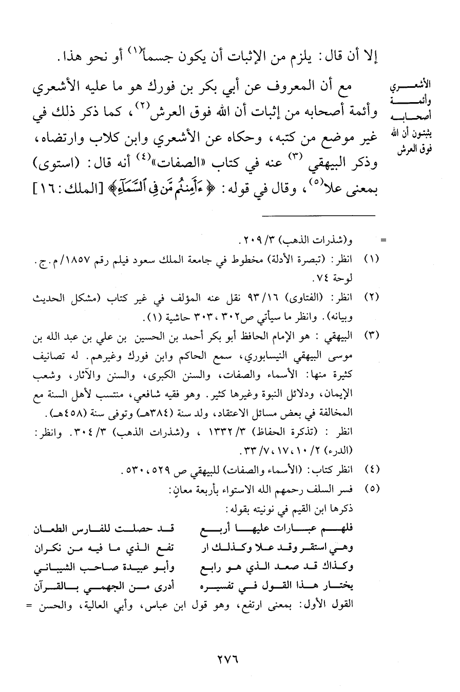 إلا أن قال يلزم من الإثبات أن يكون جسماً أو نحو هذا مع أن المعروف عن أبي بكر بن فورك هو ما عليه الأشعري وأئمة أصحابه من إثبات أن الله فوق العرش كما ذكر ذلك في غير موضع من كتبه وحكاه عن الأشعري وابن كلاب وارتضاه وذكر البيهقي عنه في كتاب الصفات أنه قال استوى بمعنى علا وقال في قوله أَأَمِنتُم مَّن فِي السَّمَاء [الملك 16]