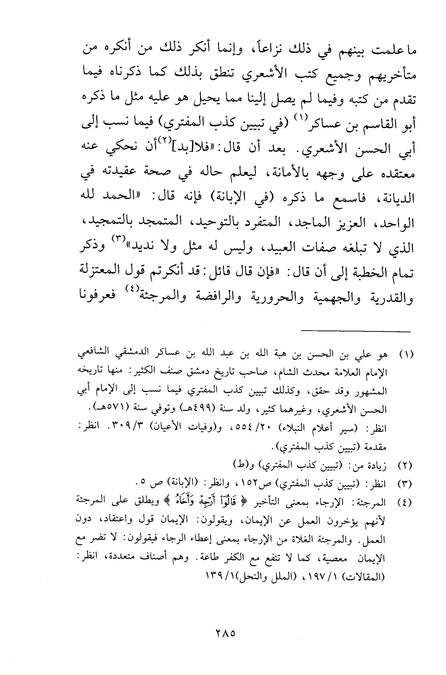 ما علمت بينهم في ذلك نزاعاً وإنما أنكر ذلك من أنكره من متأخريهم وجميع كتب الأشعري تنطق بذلك كما ذكرناه فيما تقدم من كتبه وفيما لم يصل إلينا مما يحيل هو عليه مثل ما ذكره أبو القاسم بن عساكر في تبيين كذب المفتري فيما نسب إلى أبي الحسن الأشعري بعد أن قال فلا بد أن نحكي عنه معتقده على وجهه بالأمانة ليعلم حاله في صحة عقيدته في الديانة فاسمع ما ذكره في الإبانة فإنه قال الحمد لله الواحد العزيز الماجد المتفرد بالتوحيد المتمجد بالتمجيد الذي لا تبلغه صفات العبيد وليس له مثل ولا نديد وذكر تمام الخطبة إلى أن قال فإن قال قائل قد أنكرتم قول المعتزلة والقدرية والجهمية والحرورية والرافضة والمرجئة فعرفونا