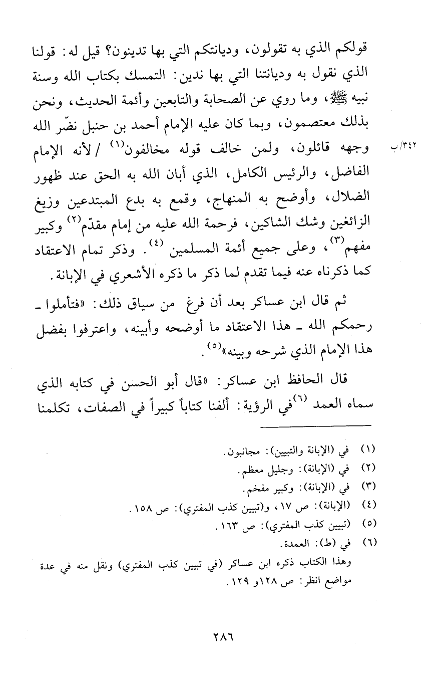 قولكم الذي به تقولون وديانتكم التي بها تدينون قيل له قولنا الذي نقول به وديانتنا التي بها ندين التمسك بكتاب الله وسنة نبيه صلى الله عليه وسلم وما روي عن الصحابة والتابعين وأئمة الحديث ونحن بذلك معتصمون وبما كان عليه الإمام أحمد بن حنبل نضّر الله وجهه قائلون ولمن خالف قوله مخالفون لأنه الإمام الفاضل والرئيس الكامل الذي أبان الله به الحق عند ظهور الضلال وأوضح به المنهاج وقمع به بدع المبتدعين وزيغ الزائغين وشك الشاكين فرحمة الله عليه من إمام مقدّم وكبير مفهم وعلى جميع أئمة المسلمين وذكر تمام الاعتقاد كما ذكرناه عنه فيما تقدم لما ذكر ما ذكره الأشعري في الإبانة ثم قال ابن عساكر بعد أن فرغ من سياق ذلك فتأملوا رحمكم الله هذا الاعتقاد ما أوضحه وأبينه واعترفوا بفضل هذا الإمام الذي شرحه وبينه قال الحافظ ابن عساكر قال أبو الحسن في كتابه الذي سماه العمد في الرؤية ألفناً كتابأ كبيراً في الصفات تكلمنا