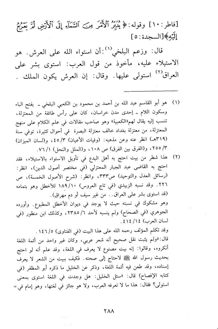 [فاطر 10] وقوله يُدَبِّرُ الْأَمْرَ مِنَ السَّمَاءِ إِلَى الْأَرْضِ ثُمَّ يَعْرُجُ إِلَيْهِ [السجدة 5] قال وزعم البلخي أن استواء الله على العرش هو الاستيلاء عليه مأخوذ من قول العرب استوى بشر على العراق استولى عليها وقال إن العرش يكون الملك
