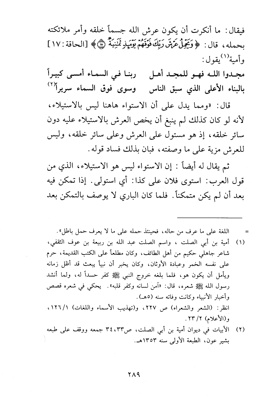 فيقال ما أنكرت أن يكون عرش الله جسماً خلقه وأمر ملائكته بحمله قال وَيَحْمِلُ عَرْشَ رَبِّكَ فَوْقَهُمْ يَوْمَئِذٍ ثَمَانِيَةٌ {17} [الحاقة 17] وأمية يقول مجدوا الله فهو للمجد أهل ربنا في السماء أمسى كبيراً بالبناء الأعلى الذي سبق الناس وسوى فوق السماء سريراً قال ومما يدل على أن الاستواء هاهنا ليس بالاستيلاء لأنه لو كان كذلك لم ينبغ أن يخص العرش بالاستيلاء عليه دون سائر خلقه إذ هو مستول على العرش وعلى سائر خلقه وليس للعرش مزية على ما وصفته فبان بذلك فساد قوله ثم يقال له أيضاً إن الاستواء ليس هو الاستيلاء الذي من قول العرب استوى فلان على كذا أي استولى إذا تمكن فيه بعد أن لم يكن متمكناً فلما كان الباري لا يوصف بالتمكن بعد