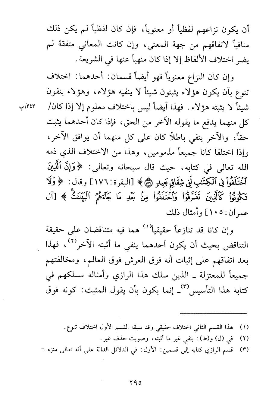 أن يكون نزاعهم لفظياً أو معنوياً فإن كان لفظياً لم يكن ذلك منافياً لاتفاقهم من جهة المعنى وإن كانت المعاني متفقة لم يضر اختلاف الألفاظ إلا إذا كان منهياً عنها في الشريعة وإن كان النزاع معنوياً فهو أيضاً قسمان أحدهما اختلاف تنوع بأن يكون هؤلاء يثبتون شيئاً لا ينفيه هؤلاء وهؤلاء ينفون شيئاً لا يثبته هؤلاء فهذا أيضاً ليس باختلاف معلوم إلا إذا كان كل منهما يدفع ما يقوله الآخر من الحق فإذا كان أحدهما يثبت حقاً والآخر ينفي باطلاً كان على كل منهما أن يوافق الآخر وإذا اختلفا كانا جميعاً مذمومين وهذا من الاختلاف الذي ذمه الله تعالى في كتابه حيث قال سبحانه وتعالى وَإِنَّ الَّذِينَ اخْتَلَفُواْ فِي الْكِتَابِ لَفِي شِقَاقٍ بَعِيدٍ {176} [البقرة 176] وقال وَلاَ تَكُونُواْ كَالَّذِينَ تَفَرَّقُواْ وَاخْتَلَفُواْ مِن بَعْدِ مَا جَاءهُمُ الْبَيِّنَاتُ [آل عمران 105] وأمثال ذلك وإن كانا قد تنازعاً حقيقياً هما فيه متناقضان على حقيقة التناقض بحيث أن يكون أحدهما ينفي ما أثبته الآخر فهذا بعد اتفاقهم على إثبات أنه فوق العرش فوق العالم ومخالفتهم جميعاً للمعتزلة الذين سلك هذا الرازي وأمثاله مسلكهم في كتابه هذا التأسيس إنما يكون بأن يقول المثبت كونه فوق