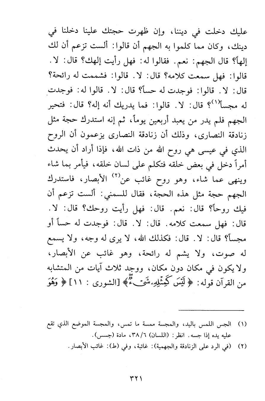 عليك دخلت في ديننا وإن ظهرت حجتك علينا دخلنا في دينك وكان مما كلموا به الجهم أن قالوا ألست تزعم أن لك إلهاً قال الجهم نعم فقالوا له فهل رأيت إلهك قال لا قالوا فهل سمعت كلامه قال لا قالوا فشممت رائحة قال لا قالوا فوجدت له حساً قال لا قالوا له فوجدت له مجساً قال لا قالوا فما يدريك أنه إله قال فتحير الجهم فلم يدر من يعبد أربعين يوماً ثم إنه استدرك حجة مثل زنادقة النصارى وذلك أن زنادقة النصارى يزعمون أن الروح الذي في عيسى هي روح الله من ذات الله فإذا أراد أن يحدث أمراً دخل في بعض خلقه فتكلم على لسان خلقه فيأمر بما شاء وينهي عما شاء وهو روح غائب عن الأبصار فاستدرك الجهم حجة مثل هذه الحجة فقال للسمني ألست تزعم أن فيك روحاً قال نعم فقال هل رأيت روحك قال لا قال فهل سمعت كلامه قال لا قال فوجدت له حساً أو مجساً قال لا قال فكذلك الله لا يرى له وجه ولا يسمع له صوت ولا يشم له رائحة وهو غائب عن الأبصار ولا يكون في مكان دون مكان ووجد ثلاث آيات من المتشابه من القرآن قوله لَيْسَ كَمِثْلِهِ شَيْءٌ [الشورى 11] وَهُوَ