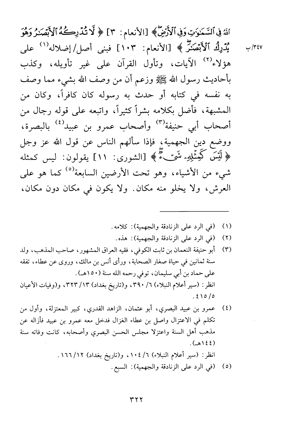 اللهُ فِي السَّمَاوَاتِ وَفِي الأَرْضِ [الأنعام 3] لاَّ تُدْرِكُهُ الأَبْصَارُ وَهُوَ يُدْرِكُ الأَبْصَارَ [الأنعام 103] فبنى أصل إضلاله على هؤلاء الآيات وتأول القرآن على غير تأويله وكذب بأحاديث رسول الله صلى الله عليه وسلم وزعم أن من وصف الله بشيء مما وصف به نفسه في كتابه أو حدث به رسوله كان كافراً وكان من المشبهة فأضل بكلامه بشراً كثيراً واتبعه على قوله رجال من أصحاب أبي حنيفة وأصحاب عمرو بن عبيد بالبصرة ووضع دين الجهمية فإذا سألهم الناس عن قول الله عز وجل لَيْسَ كَمِثْلِهِ شَيْءٌ [الشورى 11] يقولون ليس كمثله شيء من الأشياء وهو تحت الأرضين السابعة كما هو على العرش ولا يخلو منه مكان ولا يكون في مكان دون مكان