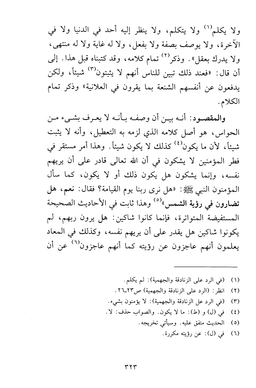 ولا يكلم ولا يتكلم ولا ينظر إليه أحد في الدنيا ولا في الآخرة ولا يوصف بصفة ولا بفعل ولا له غاية ولا له منتهى ولا يدرك بعقل وذكر تمام كلامه وقد كتبناه قبل هذا إلى أن قال فعند ذلك تبين لناس أنهم لا يثبتون شيئاً ولكن يدفعون عن أنفسهم الشنعة بما يقرون في العلانية وذكر تمام الكلام والمقصود أنه بين أن وصفه بأنه لا يعرف بشيء من الحواس هو أصل كلامه الذي لزم به التعطيل وأنه لا يثبت شيئاً لأن ما يكون كذلك لا يكون شيئاً وهذا أمر مستقر في فطر المؤمنين لا يشكون في أن الله تعالى قادر على أن يريهم نفسه وإنما يشكون هل يكون ذلك أو لا يكون كما سأل المؤمنون النبي صلى الله عليه وسلم هل نرى ربنا يوم القيامة فقال نعم هل تضارون في رؤية الشمس وهذا ثابت في الأحاديث الصحيحة المستفيضة المتواترة فإنما كانوا شاكين هل يرون ربهم لم يكونوا شاكين هل يقدر على أن يريهم نفسه وكذلك في المعاد يعلمون أنهم عاجزون عن رؤيته كما أنهم عاجزون عن أن