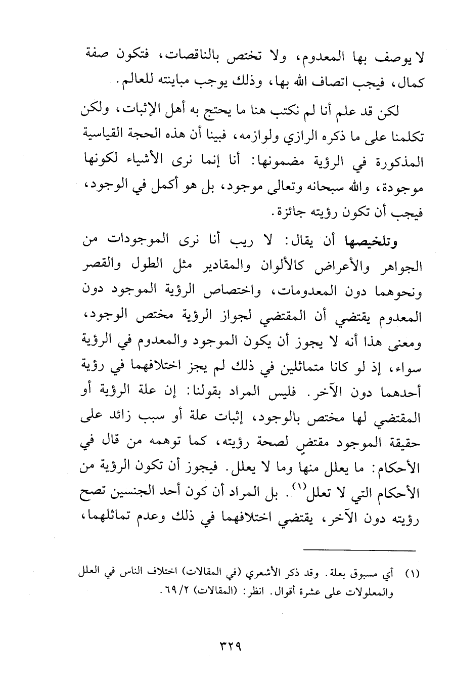 لا يوصف بها المعدوم ولا تختص بالناقصات فتكون صفة كمال فيجب اتصاف الله بها وذلك يوجب مباينته للعالم لكن قد علمنا أنا لم نكتب هنا ما يحتج به أهل الإثبات ولكن تكلمنا على ما ذكره الرازي ولوازمه فبينا أن هذه الحجة القياسية المذكورة في الرؤية مضمونها أنا إنما نرى الأشياء لكونها موجودة والله سبحانه وتعالى موجود بل هو أكمل في الوجود فيجب أن تكون رؤيته جائزة وتلخيصها أن يقال لا ريب أنا نرى الموجودات من الجواهر والأعراض كالألوان والمقادير مثل الطول والقصر ونحوهما دون المعدومات واختصاص الرؤية الموجود دون المعدوم يقتضي أن المقتضي لجواز الرؤية مختص الوجود ومعنى هذا أنه لا يجوز أن يكون الموجود والمعدوم في الرؤية سواء إذ لو كانا متماثلين في ذلك لم يجز اختلافهما في رؤية أحدهما دون الآخر فليس المراد بقولنا إن علة الرؤية أو المقتضي لها مختص بالوجود إثبات علة أو سبب زائد على حقيقة الموجود مقتضٍ لصحة رؤيته كما توهمه من قال في الأحكام ما يعلل منها وما لا يعلل فيجوز أن تكون الرؤية من الأحكام التي لا تعلل بل المراد أن كون أحد الجنسين تصح رؤيته دون الآخر يقتضي اختلافهما في ذلك وعدم تماثلهما