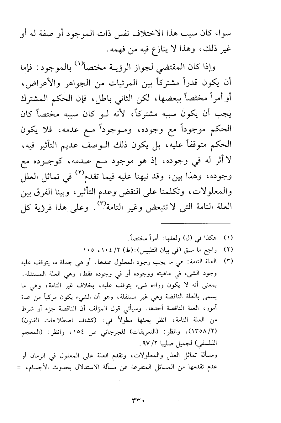 سواء كان سبب هذا الاختلاف نفس ذات الموجود أو صفة له أو غير ذلك وهذا لا ينازع فيه من فهمه وإذا كان المقتضي بجواز الرؤية مختصاً بالموجود فإما أن يكون قدراً مشتركاً بين المرئيات من الجواهر والأعراض أو أمراً مختصاً ببعضها لكن الثاني باطل فإن الحكم المشترك يجب أن يكون سببه مشتركاً لأنه لو كان سببه مختصاً كان الحكم موجوداً مع وجوده وموجوداً مع عدمه فلا يكون الحكم متوقفاً عليه بل يكون ذلك الوصف عديم التأثير فيه لا أثر له في وجوده إذ هو موجود مع عدمه كوجوده مع وجوده وهذا بين وقد نبهنا عليه فيما تقدم في تمال العلل والمعلولات وتكلمنا على النقض وعدم التأثير وبينا الفرق بين العلة التامة التي لا تتبعض وغير التامة وعلى هذا فرؤية كل