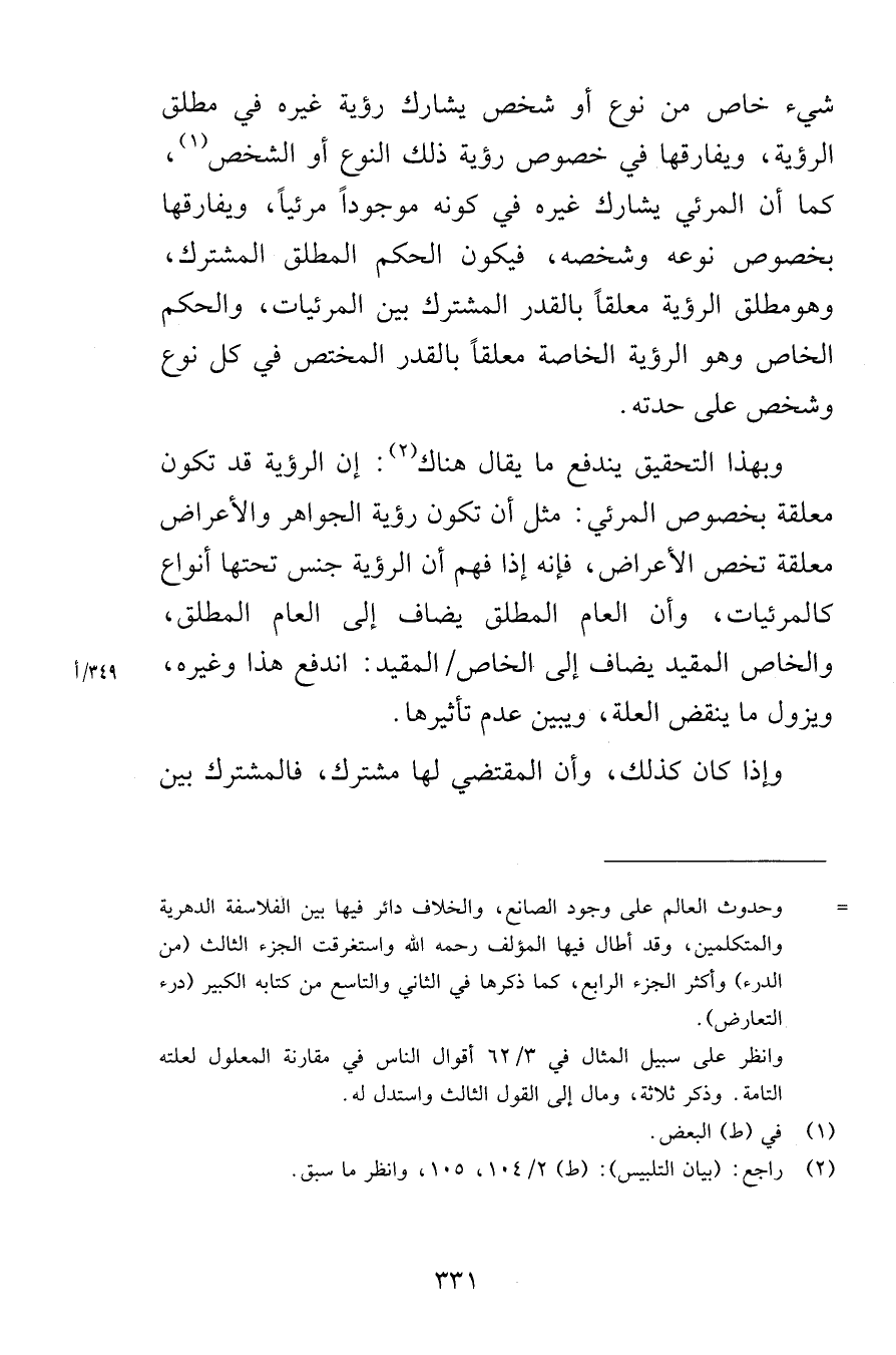 شيء خاص من نوع أو شخص يشارك رؤية غيره في مطلق الرؤية ويفارقها في خصوص رؤية ذلك النوع أو الشخص كما أن المرئي يشارك غيره في كونه موجوداً مرئياً ويفارقها بخصوص نوعه وشخصه فيكون الحكم المطلق المشترك وهومطلق الرؤية معلقاً بالقدر المشترك بين المرئيات والحكم الخاص وهو الرؤية الخاصة معلقاً بالقدر المختص في كل نوع وشخص على حدته وبهذا التحقيق يندفع ما يقال هناك إن الرؤية قد تكون معلقة بخصوص المرئي مثل أن تكون رؤية الجواهر والأعراض معلقة تخص الأعراض فإنه إذا فهم أن الرؤية جنس تحتها أنواع كالمرئيات وأن العام المطلق يضاف إلى العام المطلق والخاص المقيد يضاف إلى الخاص المقيد اندفع هذا وغيره ويزول ما ينقض العلة ويبين عدم تأثيرها وإذا كان كذلك وأن المقتضي لها مشترك فالمشترك بين