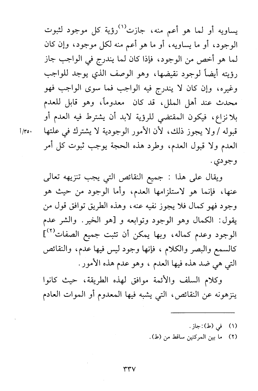 يساويه أو لما هو أعم منه جازت رؤية كل موجود لثبوت الوجود أو ما يساويه أو ما هو أعم منه لكل موجود وإن اكن لما هو أخص من الوجود فإذا كان لما يندرج في الواجب جاز رؤيته أيضاً لوجود نقيضها وهو الوصف الذي يوجد للواجب وغيره وإن كان لا يندرج فيه الواجب فما سوى الواجب فهو محدث عند أهل الملل قد كان معدوماً وهو قابل للعدم بلا نزاع فيكون المقتضي للرؤية لابد أن يشترط فيه العدم أو قبوله ولا يجوز ذلك لأن الأمور الوجودية لا يشترك في علتها العدم ولا قبول العدم وطرد هذه الحجة يوجب ثبوت كل أمر وجودي ويقال على هذا جميع لنقائص التي يجب تنزيهه تعالى عنها فإنما هو لاستلزامها العدم وأما الوجود من حيث هو وجود فهو كمال فلا يجوز نفيه عنه وهذه الطريق توافق قول من يقول الكمال وهو الوجود وتوابعه وهو الخير والشر عدم الوجود وعدم كماله وبها يمكن أن نثبت جميع الصفات كالسمع والبصر والكلام فإنها وجود ليس فيها عدم والنقائص التي هي ضد هذه فيها العدم وهو عدم هذه الأمور وكلام السلف والأئمة موافق لهذه الطريقة حيث كانوا ينزهونه عن النقائص التي يشبه فيها المعدوم أو الموات العادم