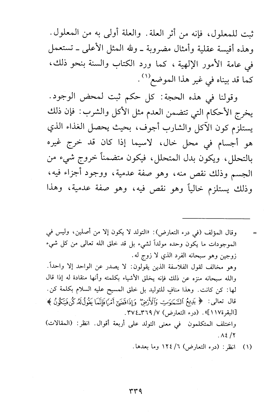 ثبت للمعلول فإنه من أثر العلة والعلة أولى به من المعلول وهذه أقيسة عقلية وأمثال مضروبة ولله المثل الأعلى تستعمل في عامة الأمور الإلهية كما ورد الكتاب والسنة بنحو ذلك كما قد بيناه في غير هذا الموضع وقولنا في هذه الحجة كل حكم ثبت لمحض الوجود يخرج الأحكام التي تتضمن العدم مثل الأكل والشرب فإن ذلك يستلزم كون الآكل والشارب أجوف بحيث يحصل الغذاء الذي هو أجسام في محل خال لاسيما إذا كان قد خرج غيره بالتحلل ويكون بدل المتحلل فيكون متضمناً خروج شيء من الجسم وذلك نقص منه وهو صفة عدمية ووجود أجزاء فيه وذلك يستلزم خالياً وهو نقص فيه وهو صفة عدمية وهذا