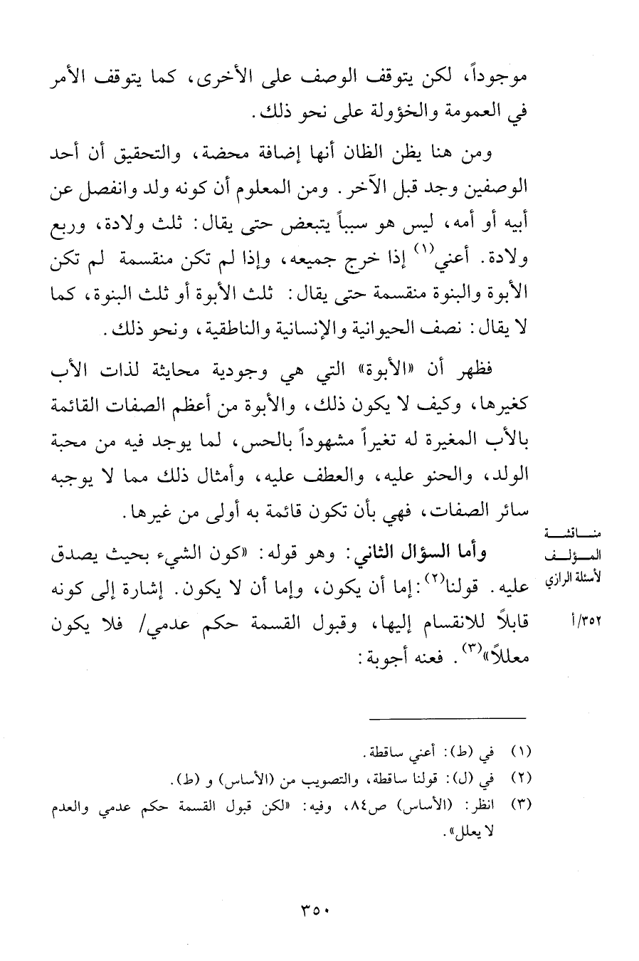موجوداً لكن يتوقف الوصف على الأخرى كما يتوقف الأمر في العمومة والخؤولة على نحو ذلك ومن هنا يظن الظان أنها إضافة محضة والتحقيق أن أحد الوصفين وجد قل الآخر ومن المعلوم أن كونه ولد وانفصل عن أبيه وأمه ليس هو سبباً يتبعض حتى يقال ثلث ولادة وربع ولادة أعني إذا خرج جميعه وإذا لم تكن منقسمة لم تكن الأبوة والبنوة منقسمة حتى يقال ثلث الأبوة أو ثلث البنوة كما لا يقال نصف الحيوانية والإنسانية والناطقية ونحو ذلك فظهر أن الأبوة التي هي وجودية محايثة لذات الرب كغيرها وكيف لا يكون ذاك والأبوة من أعظم الصفات القائمة بالأب المغيرة له تغيراً مشهوداً بالحس لما يوجد فيه من محبة الولد والحنو عليه والعطف عليه وأمثال ذلك مما لا يوجبه سائر الصفات فهي بأن تكون قائمة به أولى من غيرها وأما السؤال الثاني وهو قوله كون الشيء بحيث يصدق عليه قولنا إما أن يكون وإما أن لا يكون إشارة إلى كونه قابلاً للإنقسام إليها وقبول القسمة حكم عدمي فلا يكون معللاً فعنه أجوبة