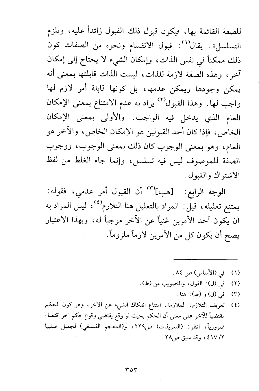 للصفة القائمة بها فيكون قبول ذلك القبول زائداً عليه ويلزم التسلسل يقال قبول الانقسام ونحوه من الصفات كون ذلك ممكناً في نفس الذات وإمكان الشيء لا يحتاج إلى إمكان آخر وهذه الصفة لازمة للذات ليست الذات قابلتها بمعنى أنه يمكن وجودها ويمكن عدمها بل كونها قابلة أمر لازم لها واجب لها وهذا القبول يراد به عدم الامتناع بمعنى الإمكان العام الذي يدخل فيه الواجب والأولى بمعنى الإمكان الخاص فإذا كان أحد القبولين هو الإمكان الخاص والآخر هو العام وهو بمعنى الوجوب كان ذلك بمعنى الوجوب ووجوب الصفة للموصوف ليس فيه تسلسل وإنما جاء الغلط من لفظ الاشتراك والقبول الوجه الرابع هب أن القبول أمر عدمي فقوله يمتنع تعليله قيل المراد بالتعليل هنا التلازم ليس المراد به أن يكون أحد الأمرين غنياً عن الآخر موجباً له وبهذا الاعتبار يصح أن يكون كل من الأمرين لازماً ملزوماً