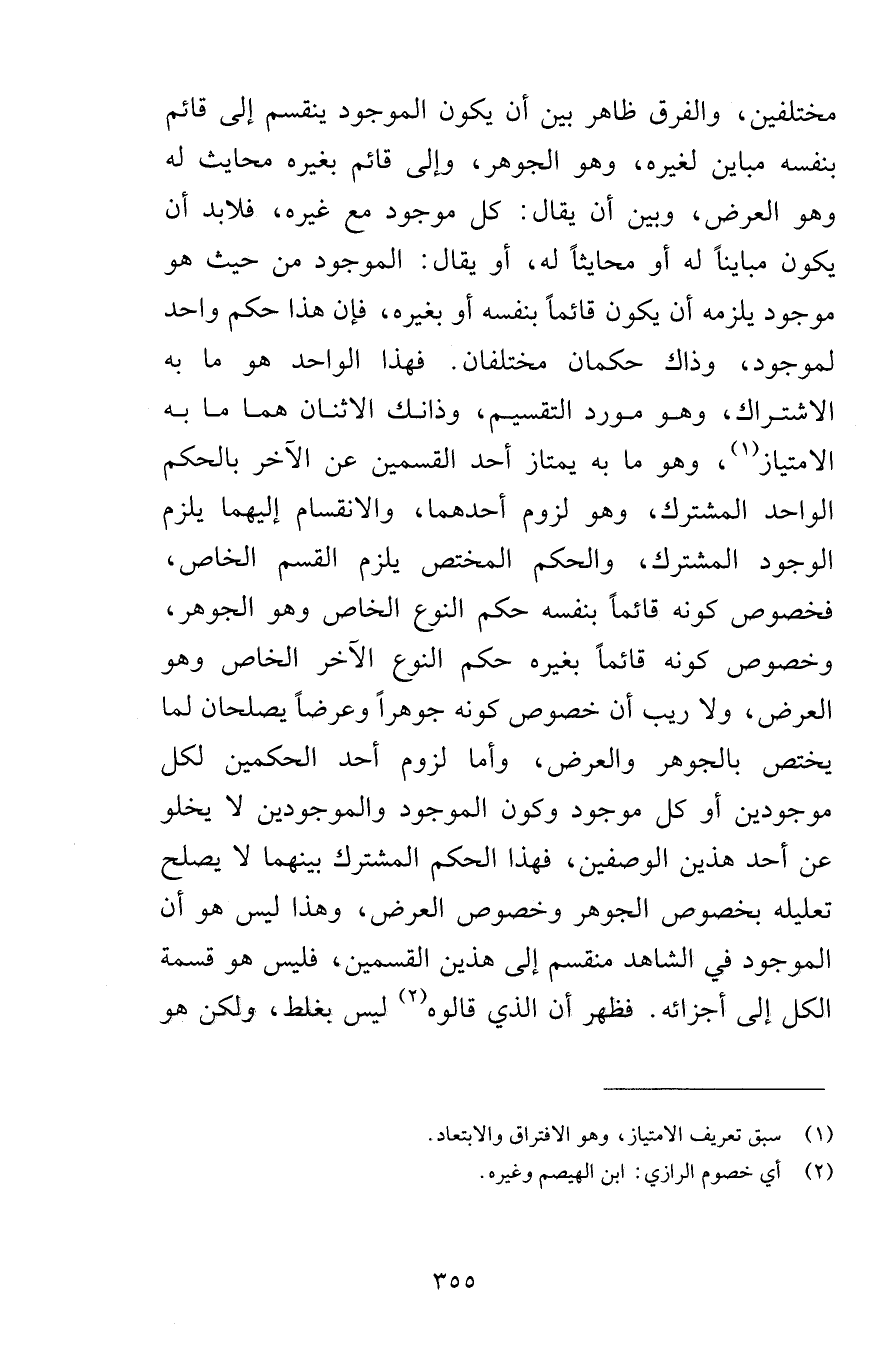 مختلفين والفرق ظاهر بين أن يكون الموجود ينقسم إلى قائم لنفسه مباين لغيره وهو الجوهر وهو قائم بغيره محايث له وهو العرض وبين أن يقال كل موجود مع غيره فلابد أن يكون مبايناً له أو محايثاً له أو يقال الموجود من حيث هو موجود يلزمه أن يكون قائماً بنفسه أو بغيره فإن هذا حكم واحد لموجود وذاك حكمان مختلفان فهذا الواحد هو ما به الاشتراك وهو مورد التقسيم وذانك الاثنان هما ما به الامتياز وهو ما به يمتاز أحد القسمين عن الآخر بالحكم الواحد المشترك وهو لزوم أحدهما والانقسام إليهما يلزم الوجود المشترك والحكم المختص يلزم القسم الخاص فخصوص كونه قائماً بنفسه حكم النوع الخاص وهو الجوهر وخصوص كونه قائماً بغيره حكم النوع الآخر الخاص وهو العرض ولا ريب أن خصوص كونه جوهراً وعرضاً يصلحان لما يختص بالجوهر والعرض وأما لزوم أحد الحكمين لكل موجودين أو كل موجود وكون الموجود والموجودين لا يخلو عن أحد هذين الوصفين فهذا الحكم المشترك بينهما لا يصلح تعليله بخصوص الجوهر وخصوص العرض وهذا ليس هو أن الموجود في الشاهد منقسم إلى هذين القسمين فليس هو قسمة الكل إلى أجزائه فظهر أن الذي قالوه ليس بغلط ولكن هو