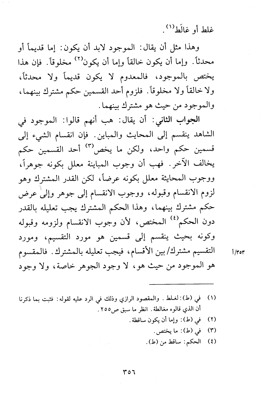 غلط غالًط وهذا مثل أن يقال الموجود لابد أن يكون إما قديماً أو محدثاً وإما أن يكون خالقاً وإما أن يكون مخلوقاً فإن هذا يختص بالموجود فالمعدوم لا يكون قديماً ولا محدثاً ولا خالقاً ولا مخلوقاً فلزوم أحد القسمين حكم مشترك بينهما والموجود من حيث هو مشترك بينهما الجواب الثاني أن يقال هي أنهم قالوا الموجود في الشاهد ينقسم إلى المحايث والمباين فإن انقسام الشيء إلى قسمين حكم واحد ولكن ما يخص أحد القسمين حكم يخالف الآخر فهب أن وجوب المباينة معلل بكونه جوهراً ووجوب المحايثة معلل بكونه عرضاً لكن القدر المشترك وهو لزوم الانقسام وقبوله ووجوب الانقسام إلى جوهر وإلى عرض حكم مشترك بينهما وهذا الحكم المشترك يجب تعليله بالقدر دون الحكم المختص لأن وجوب الانقسام ولزومه وقبوله وكونه بحيث ينقسم إلى قسمين هو مورد التقسيم ومورد التقسيم مشترك بين الأقسام فيجب تعليله بالمشترك فالمقسوم هو الموجود من حيث هو لا وجود الجوهر خاصة ولا وجود