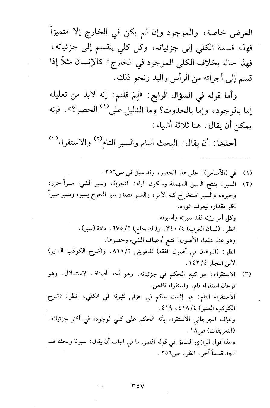 العرض خاصة والموجود وإن لم يكن في الخارج إلا متميزاً فهذه قسمة الكلي إلى جزئياته فهذا حاله بخلاف الكلي الموجود في الخارج كالإنسان مثلاً إذا قسم إلى أجزائه من الرأس واليد ونحو ذلك وأما قوله في السؤال الرابع لِمَ قلتم أنه لابد من تعليله إما بالوجود وإما بالحدوث وما الدليل على الحصر فإنه يمكن أن يقال هنا ثلاثة أشياء أحدها أن يقال البحث التام والسبر التام والاستقراء
