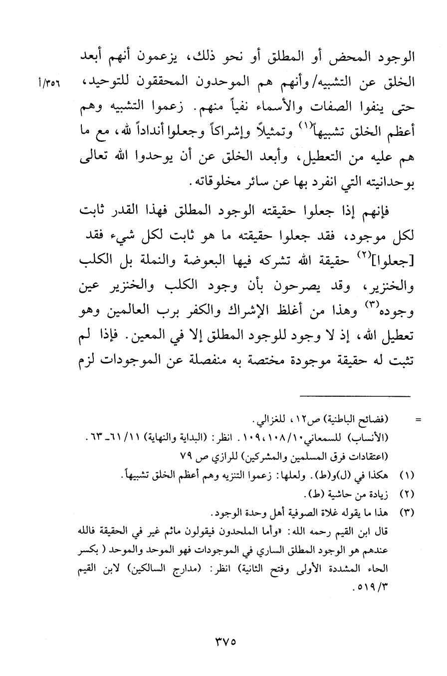 الوجود المحض أو المطلق أو نحو ذلك يزعمون أنهم أبعد الخلق عن التشبيه وأنهم هم الموحدون المحققون للتوحيد حتى ينفوا الصفات والأسماء نفياً منهم زعموا الشبيه وهم أعظم الخلق تشبيهاً وتمثيلاً وإشراكاً وجعلوا أنداداً لله مع ما هم عليه من التعطيل وأبعد الخلق عن أن يوحدوا الله تعالى بوحدانيته التي انفرد بها عن سائر مخلوقاته فإنهم جعلوا حقيقته الوجود المطلق فهذا القدر ثابت لكل موجودة فقد جعلوا حقيقته ما هو ثابت لكل شيء فقد جعلوا حقيقة الله تشركه فيها البعوضة والنملة بل الكلب والخنزير وقد يصرحون بأن وجود الكلب والخنزير عين وجوده وهذا من أغلظ الإشراك والكفر برب العالمين وهو تعطيل الله إذ لا وجود للوجود المطلق إلا في المعين فإذا لم تثبت له حقيقة موجودة مختصة به منفصلة عن الموجودات لزم