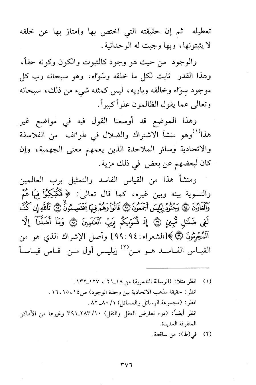 تعطيله ثم إن حقيقته التي اختص بها وامتاز بها عن خلقه لا يثبتونها وبها وجبت له الوحدانية والوجود من حيث هو وجود كالثبوت والكون وكونه حقاً وهذا القدر ثابت لكل ما خلقه وسَوّاه وهو سبحانه رب كل موجود سِوَاه وخالقه وباريه ليس كمثله شيء من ذلك سبحانه وتعالى عما يقول الظالمون علواً كبيراً وهذا الموضع قد أوسعنا القول فيه في مواضع غير هذا وهو منشأ الاشتراك والضلال في طوائف من الفلاسفة والاتحادية وسائر الملاحدة الذين يعمهم معنى الجهمية وإن كان لبعضهم عن بعض في ذلك مزية ومنشأ هذا من القياس الفاسد والتمثيل برب العالمين والتسوية بينه وبين غيره كما قال تعالى فَكُبْكِبُوا فِيهَا هُمْ وَالْغَاوُونَ {94} وَجُنُودُ إِبْلِيسَ أَجْمَعُونَ {95} قَالُوا وَهُمْ فِيهَا يَخْتَصِمُونَ {96} تَاللَّهِ إِن كُنَّا لَفِي ضَلَالٍ مُّبِينٍ {97} إِذْ نُسَوِّيكُم بِرَبِّ الْعَالَمِينَ {98} وَمَا أَضَلَّنَا إِلَّا الْمُجْرِمُونَ {99} [الشعراء 94-99] وأصل الإشراك الذي هو من القياس الفاسد هو من إبليس أول من قاس قياساً