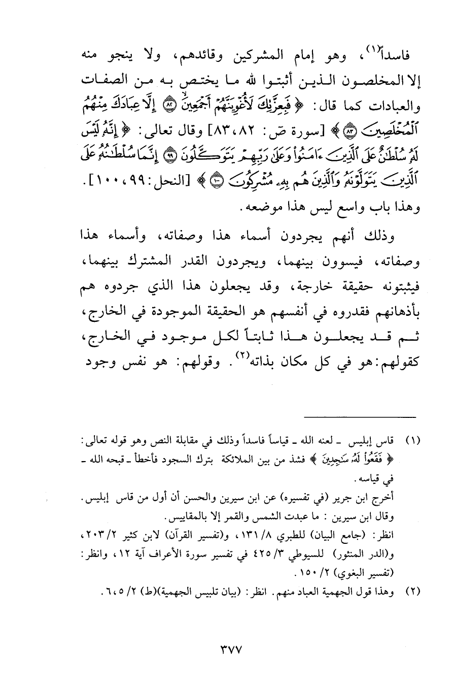 فاسداً وهو إمام المشركين وقائدهم ولا ينجو منه إلا المخلصون الذين أثبتوا لله ما يختص به من الصفات والعبادات كما قال فَبِعِزَّتِكَ لَأُغْوِيَنَّهُمْ أَجْمَعِينَ {82} إِلَّا عِبَادَكَ مِنْهُمُ الْمُخْلَصِينَ {83} [ص 82-83] وقال تعالى إِنَّهُ لَيْسَ لَهُ سُلْطَانٌ عَلَى الَّذِينَ آمَنُواْ وَعَلَى رَبِّهِمْ يَتَوَكَّلُونَ {99} إِنَّمَا سُلْطَانُهُ عَلَى الَّذِينَ يَتَوَلَّوْنَهُ وَالَّذِينَ هُم بِهِ مُشْرِكُونَ {100} [النحل 99-100] وهذا باب واسع ليس هذا موضعه وذلك أنهم يجردون أسماء هذا وصفاته وأسماء هذا وصفاته فيسوون بينهما ويجردون القدر المشترك بينهما فيثبتونه حقيقة خارجة وقد يجعلون هذا الذي جردوه هم بأذهانهم فقدروه في أنفسهم هو الحقيقة الموجودة في الخارج كقولهم هو في كل مكان بذاته وقولهم هو نفس ووجود
