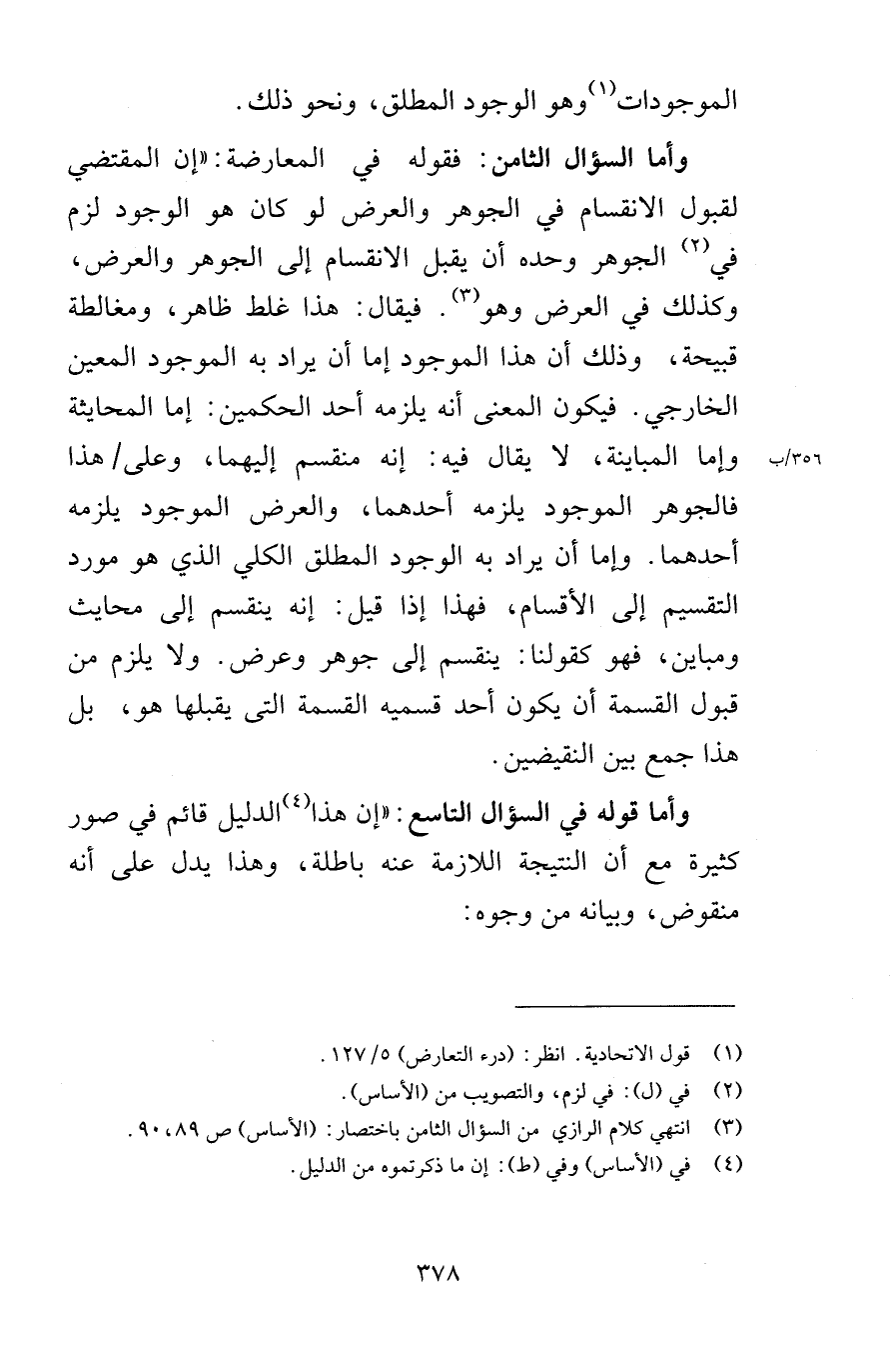 الموجودات وهو الوجود المطلق ونحو ذلك وأما السؤال الثامن فقوله في المعارضة إن المقتضي لقبول الانقسام في الجوهر والعرض لو كان هو الوجود لزم في الجوهر وحده أن يقبل الانقسام إلى الجوهر والعرض وكذلك في العرض وهو فيقال هذا غلط ظاهر ومغالطة قبيحة وذلك أن هذا الموجود إما أن يراد به الموجود المعين الخارجي فيكون المعنى أن يلزمه أحد الحكمين إما المحايثة وإما المباينة لا يقال فيها إنه منقسم إليهما وعلى هذا فالجوهر الموجود يلزمه أحدهما والعرض الموجود يلزمه أحدهما وإما أن يراد به الوجود المطلق الكلي الذي هو مورد التقسيم إلى الأقسام فهذا إذا قيل إنه ينقسم إلى محايث ومباين فهو كقولنا ينقسم إلى جوهر وعرض ولا يلزم من قبول القسمة أن يكون أحد قسميه القسمة التي يقبلها هو بل هذا جمع بين النقيضين وأما قوله في السؤال التاسع إن هذا الدليل قائم في صور كثيرة مع أن النتيجة اللازمة عنه باطلة وهذا يدل على أنه منقوض وبيانه من وجوه