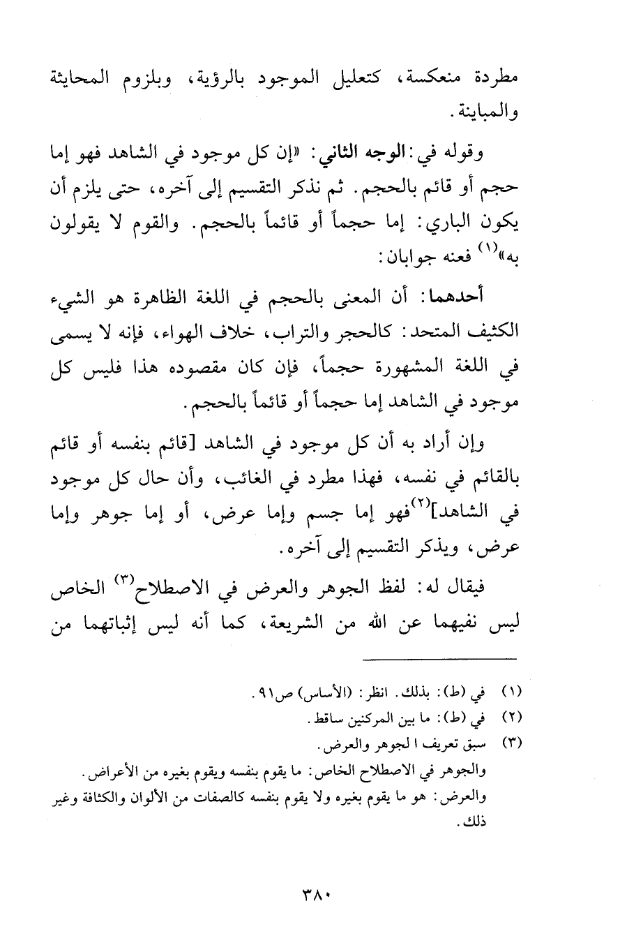 مطردة منعكسة كتعليل الموجود بالرؤية وبلزوم المحايثة والمباينة وقوله في الوجه الثاني إن كل موجود في الشاهد فهو إما حجم أو قائم بالحجم ثم نذكر التقسيم إلى آخره حتى يلزم أن يكون الباري إما حجماً أو قائماً بالحجم والقوم لا يقولون به فعنه جوابان أحدهما أن المعنى بالحجم في اللغة الظاهرة هو الشيء الكثيف المتحد كالحجر والتراب خلاف الهواء فإنه لا يسمى في اللغة المشهورة حجماً فإن كان مقصوده هذا فليس كل موجود في الشاهد إما حجماً أو قائماً بالحجم وإن أراد به أن كل موجود في الشاهد قائم بنفسه أو قائم بالقائم في نفسه فهذا مطرد في الغائب وأن حال كل موجود في الشاهد فهو إما جسم وإما عرض أو إما جوهر وإما عرض ويذكر التقسيم إلى آخره فيقال له لفظ الجوهر والعرض في الاصطلاح الخاص ليس نفيهما عن الله من الشريعة كما أنه ليس إثباتهما من