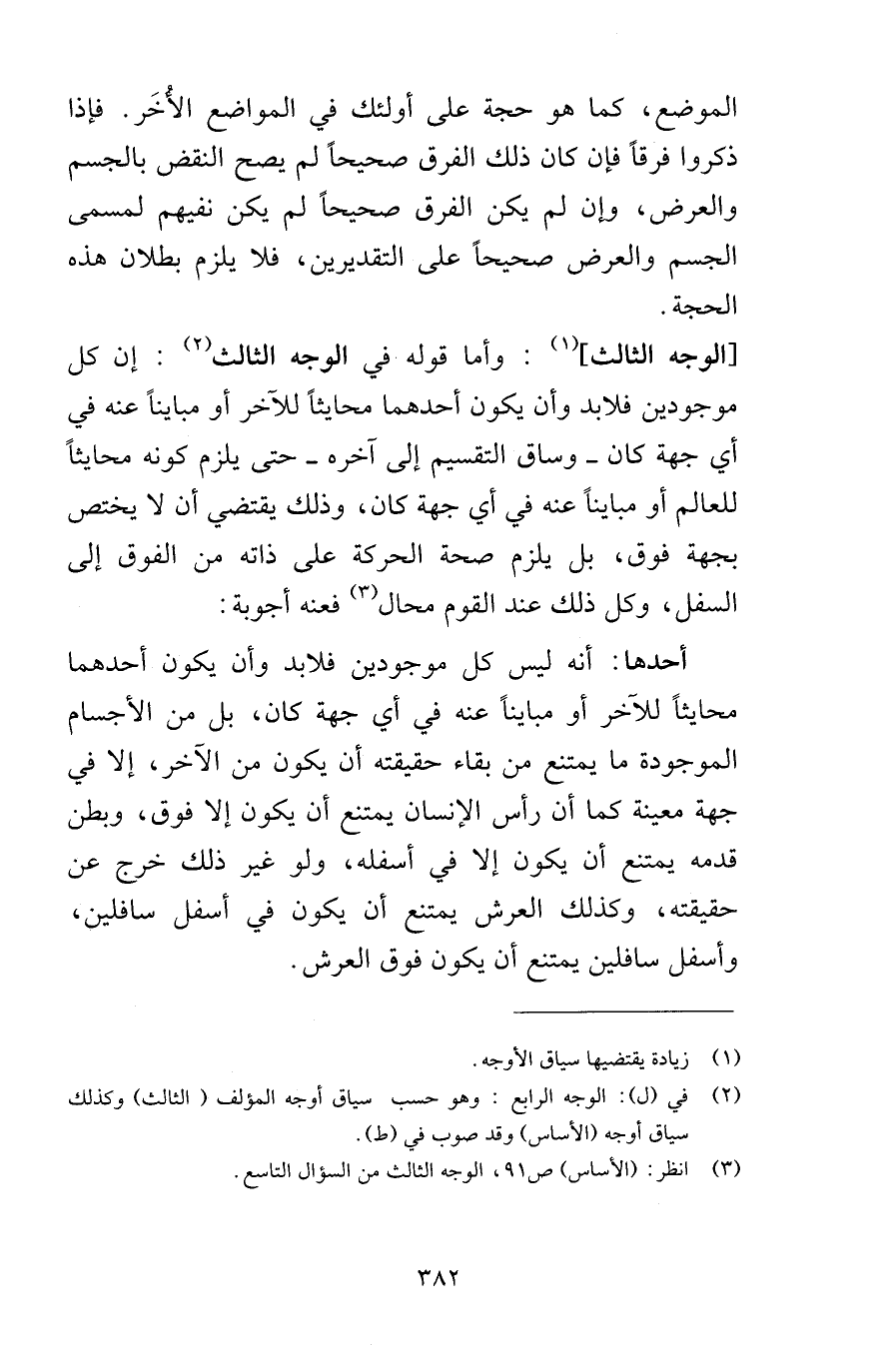 الموضع كما هو حجة على أولئك في المواضع الأُخَر فإذا ذكروا فرقاً فإن كان ذلك الفرق صحيحاً لم يصح النقض بالجسم والعرض وإن لم يكن الفرق صحيحاً لم يكن نفيهم لمسمى الجسم والعرض صحيحاً على التقديرين فلا يلزم بطلان هذه الحجة الوجه الثالث وأما قوله في الوجه الثالث إن كل موجودين فلابد وأن يكون أحدهما محايثاً للآخر أو مبايناً عنه في أي جهة كان وساق التقسيم إلى آخره حتى يلزم كونه محايثاً للعالم أو مبايناً عنه في أي جهة كان وذلك يقتضي أن لا يختص بجهة فوق بل يلزم صحة الحركة على ذاته من الفوق إلى السفل وكل ذلك عند القوم محال فعنه أجوبة أحدها أنه ليس كل موجودين فلابد وأن يكون أحدهما محايثاً للآخر أو مبايناً عنه في أي جهة كان بل من الأجسام الموجودة ما يمتنع من بقاء حقيقته أن يكون من الآخر إلا في جهة معينة كما أن رأس الإنسان يمتنع أن يكون إلا فوق وبطن قدمه يمتنع أن يكون إلا في أسفله ولو غير ذلك خرج عن حقيقته وكذلك العرش يمتنع أن يكون في أسفل سافلين وأسفل سافلين يمتنع أن يكون فوق العرش