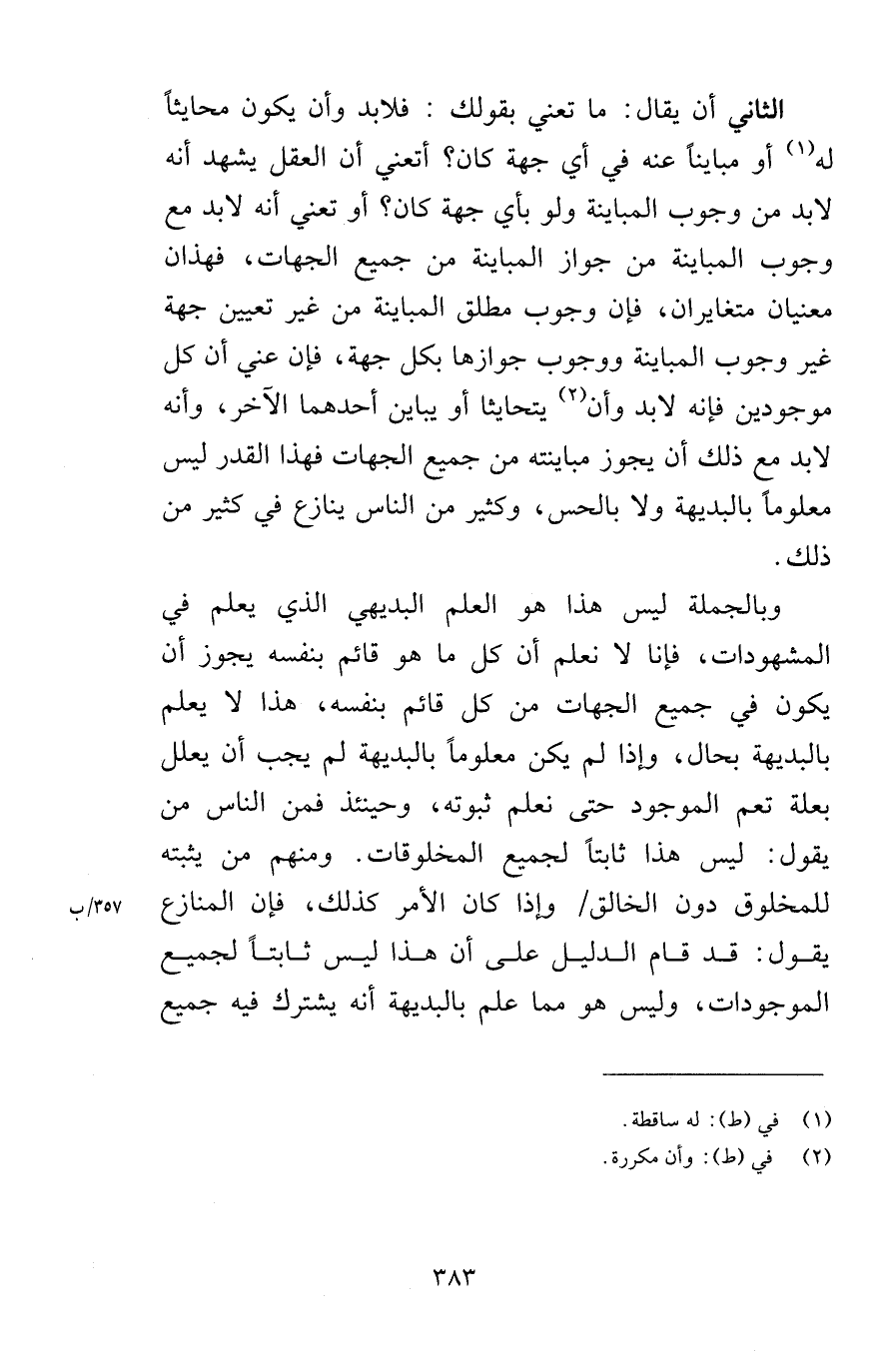 الثاني أن يقال ما تعني بقولك فلابد وأن يكون محايثاً له أو مبايناً عنه في أي جهة كان أتعني أن العقل يشهد أنه لابد من وجوب المباينة ولو بأي جهة كان أو تعني أنه لابد مع وجوب المباينة من جواز المباينة من جميع الجهات فهذان معنيان متغايران فإن وجوب مطلق المباينة من غير تعيين جهة غير وجوب المباينة ووجوب جوازها بكل جهة فإن عني أن كل موجودين فإنه ولابد أن يتحايثا أو يباين أحدهما الآخر وأنه لابد مع ذلك أن يجوز مباينته من جميع الجهات فهذا القدر ليس معلوماً بالبديهة ولا بالحس وكثير من الناس ينازع في كثير من ذلك وبالجملة ليس هذا هو العلم البديهي الذي يعلم في المشهودات فإنا لا نعلم أن كل ما هو قائم بنفسه يجوز أن يكون في جميع الجهات من كل قائم بنفسه هذا لا يعلم بالبديهة بحال وإذا لم يكن معلوماً بالبديهة لم يجب أن يعلل بعلة تعم الوجود حتى نعلم ثبوته وحينئذ فمن الناس من يقول ليس هذا ثابتاًً لجميع المخلوقات ومنهم من يثبته للمخلوق دون الخالق وإذا كان الأمر كذلك فإن المنازع يقول قد قام الدليل على أن هذا ليس ثابتاً لجميع الموجودات وليس هو مما علم بالبديهة أنه يشترك فيه جميع