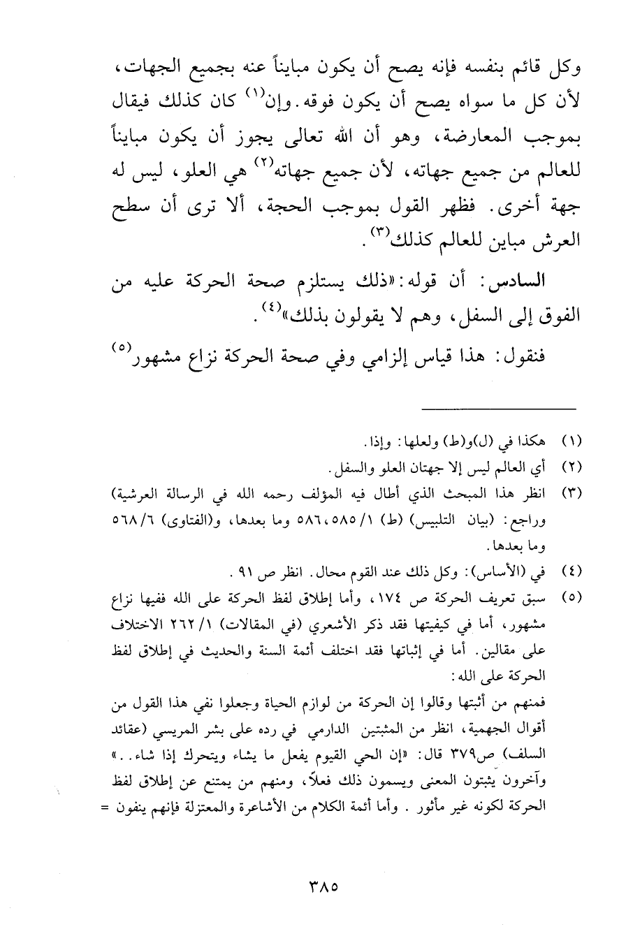 وكل قائم بنفسه فإنه يصح أن يكون مبايناً عنه بجميع الجهات لأن كل ما سواه يصح أن يكون فوقه وإن كان كذلك فيقال بموجب المعارضة وهو أن الله تعالى يجوز أن يكون مبايناً للعالم من جميع جهاته لأن جميع جهاته لأن جميع جهاته هي العلو ليس له جهة أخرى فظهر القول بموجب الحجة ألا ترى أن سطح العرش مباين للعالم كذلك السادس أن قوله ذلك يستلزم صحة الحركة عليه من الفوق إلى السفل وهم لا يقولون بذلك فنقول هذا قياس إلزامي وفي صحة الحركة نزاع مشهور