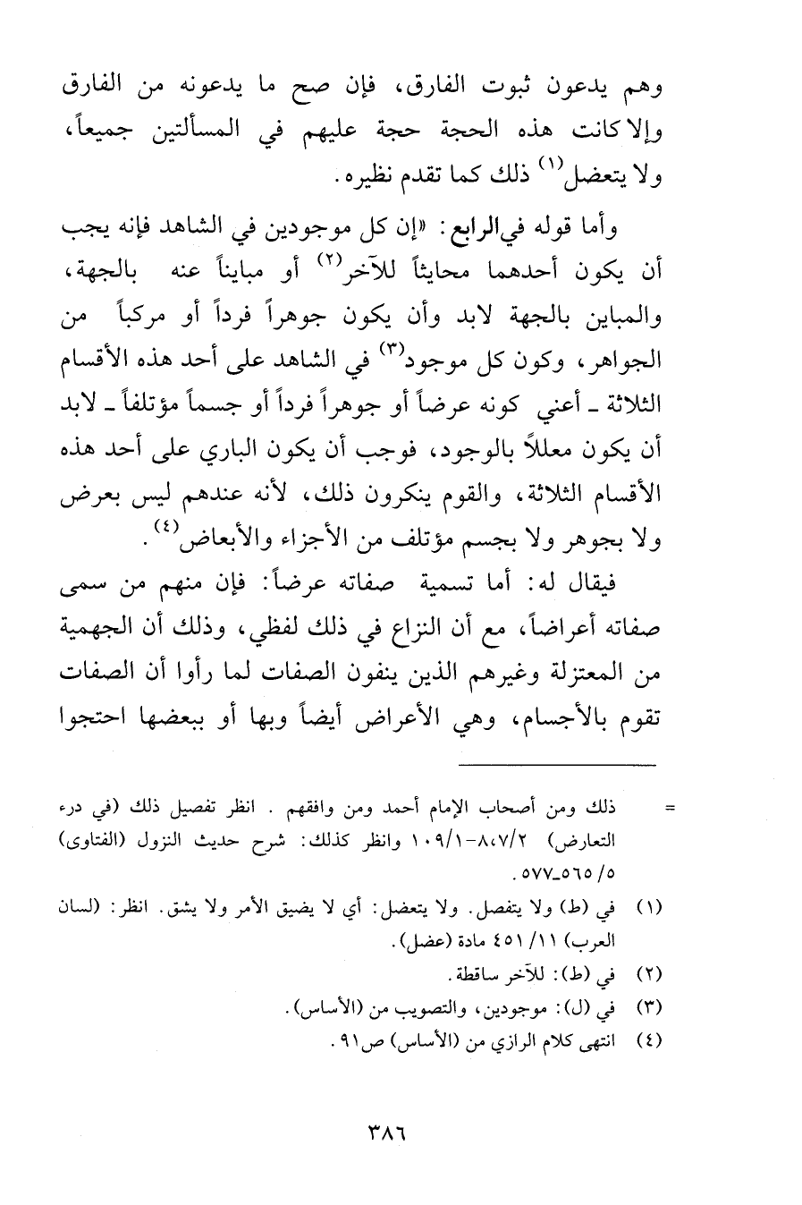 وهم يدعون ثبوت الفارق فإن صح ما يدعونه من الفارق وإلا كانت هذه الحجة حجة عليهم في المسألتين جميعاً ولا يتعضل ذلك كما تقدم نظيره وأما قوله في الرابع إن كل موجودين في الشاهد فإنه يجب أن يكون أحدهما محايثاً للآخر أو مبايناً عنه بالجهة والمباين بالجهة لابد وأن يكون جوهراً فرداً أو مركباً من الجواهر وكون كل موجود في الشاهد على أحد هذه الأقسام الثلاثة أعني كونه عرضاً أو جوهراً فرداً أو جسماً مؤتلفاً لابد أن يكون معللاً بالوجود فوجب أن يكون الباري على أحد هذه الأقسام الثلاثة والقوم ينكرون ذلك لأنه عندهم ليس بعرض ولا بجوهر ولا بجسم مؤتلف من الأجزاء والأبعاض فيقال له أما تسمية صفاته عرضاً فإن منهم من سمى صفاته أعراضاً مع أن النزاع في ذلك لفظي وذلك أن الجهمية من المعتزلة وغيرهم الذين ينفون الصفات لما رأوا أن الصفات تقوم بالأجسام وهي الأعراض أيضاً وبها أو ببعضها احتجوا