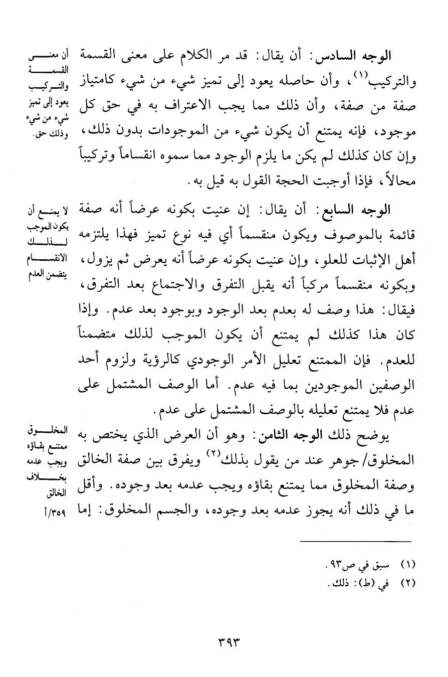 الوجه السادس أن يقال قد مر الكلام على معنى القسمة والتركيب وأن حاصله يعود إلى تميز شيء من شيء كامتياز صفة من صفة وأن ذلك مما يجب الاعتراف به في حق كل موجود فإنه يمتنع أن يكون شيء من الموجودات بدون ذلك وإن كان كذلك لم يكن ما يلزم الوجود مما سموه انقساماً وتركيباً محالاً فإذا أوجبت الحجة القول به قيل به الوجه السابع أن يقال إن عنيت بكونه عرضاً أنه صفة قائمة بالموصوف ويكون منقسماً أي فيه نوع تميز فهذا يلتزمه أهل الإثبات للعلو وإن عنيت بكونه عرضاً أنه يعرض ثم يزول وبكونه منقسماً مركباً أنه يقبل التفرق والاجتماع بعد التفرق فيقال هذا وصف له بعدم بعد الوجود وبوجود بعد عدم وإذا كان هذا كذلك لم يمتنع أن يكون الموجب لذلك متضمناً للعدم فإن الممتنع تعليل الأمر الوجودي كالرؤية ولزوم أحد الوصفين الموجودين بما فيه عدم أما الوصف المشتمل على عدم فلا يمتنع تعليله بالوصف المشتمل على عدم يوضح ذلك الوجه الثامن وهو أن العرض ... الذي يختص به المخلوق جوهر عند من يقول بذلك ويفرق بين صفة الخالق وصفة المخلوق مما يمتنع بقاؤه ويجب عدم بعد وجوده وأقل ما في ذلك أنه يجوز عدمه بعد وجوده والجسم المخلوق إما