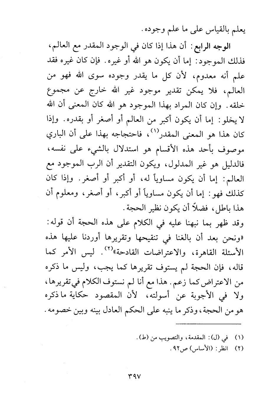 يعلم بالقياس على ماعلم وجوده الوجه الرابع أن هذا إذا كان في الوجود المقدر مع العالم فذلك الموجود إما أن يكون هو الله أو غيره فإن كان غيره فقد علم أنه معدوم لأن كل مايقدر وجوده سوى الله فهو من العالم فلا يمكن تقدير موجود غير الله خارج عن مجموع خلقه وإن كان المراد بهذا الموجود هو الله كان المعنى أن الله لا يخلو إما أن يكون أكبر من العالم أو أصغر أو بقدره وإذا كان هذا هو المعنى المقدر فاحتجاجه بهذا على أن الباري موصوف بأحد هذه الأقسام هو استدلال بالشيء على نفسه فالدليل هو غير المدلول ويكون التقدير أن الرب الموجود مع العالم إما أن يكون مساوياً له أو أكبر أو أصغر وإذا كان كذلك فهو إما أن يكون مساوياً أو أكبر أو أصغر ومعلوم أن هذا باطل فضلاً أن يكون نظير الحجة وقد ظهر بما نبهنا عليه في الكلام على هذه الحجة أن قوله ونحن بعد أن بالغنا في تنقيحها وتقريرها أوردنا عليه هذه الأسئلة القاهرة والاعتراضات القادحة ليس الأمر كما قاله فإن الحجة لم يستوف تقريرها كما يجب وليس ما ذكره من الاعتراض كما زعم هذا مع أنا لم نستوف الكلام في تقريرها ولا في الأجوبة على أسولته لأن المقصود حكاية ما ذكره هو من الحجة وذكر ما ينبه على الحكم العادل بينه وبين خصومه