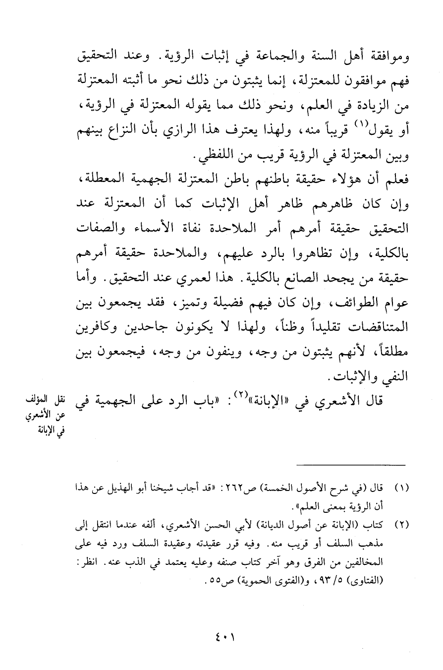 وموافقة أهل السنة والجماعة في إثبات الرؤية وعند التحقيق فهم موافقون للمعتزلة إنما يثبتون من ذلك نحو ما أثبته المعتزلة من الزيادة في العلم ونحو ذلك مما يقوله المعتزلة في الرؤية أو يقول قريباً منه ولهذا يعترف هذا الرازي بأن النزاع بينهم وبين المعتزلة في الرؤية قريب من اللفظي فعلم أن هؤلاء حقيقة باطنهم باطن المعتزلة الجهمية المعطلة وإن كان ظاهرهم ظاهر أهل الإثبات كما أن المعتزلة عند التحقيق حقيقة أمرهم أمر الملاحدة نفاة الأسماء والصفات بالكلية وإن تظاهروا بالرد عليهم والملاحدة حقيقة أمرهم حقيقة من يجحد الصانع بالكلية هذا لعمري عند التحقيق وأما عوام الطوائف وإن كان فيهم فضيلة وتميز فقد يجمعون بين المتناقضات تقليداً وظناً ولذا لا يكونون جاحدين وكافرين مطلقاً لأنهم يثبتون من وجه وينفون من وجه فيجمعون بين النفي والإثبات قال الأشعري في الإبانة باب الرد على الجهمية