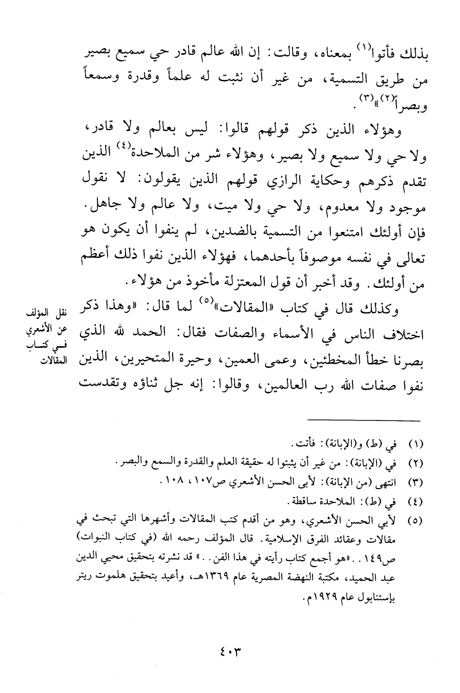 بذلك فأتوا معناه وقالت إن الله عالم قادر حي سميع بصير من طريق التسمية من غير أن نثبت له علماً وقدرة وسمعاً وبصراً وهؤلاء الذين ذكر قولهم قالوا ليس بعالم ولا قادر ولا حي ولا سميع ولا بصير وهؤلاء شر من الملاحدة الذين تقدم ذكرهم وحكاية الرازي قولهم الذين يقولون لا نقول موجود ولا معدوم ولا حي ولا ميت ولا عالم ولا جاهل فإن أولئك امتنعوا من التسمية بالضدين لم ينفوا أن يكون هو تعالى في نفسه موصوفاً بأحدهما فهؤلاء الذين نفوا ذلك أعظم من أولئك وقد أخبر أن قول المعتزلة مأخوذ من هؤلاء وكذلك قال في كتاب المقالات لما قال وهذا ذكر اختلاف الناس في الأسماء والصفات فقال الحمد لله لذي بصرنا خطأ المخطئين وعمى العمين وحيرة المتحيرين الذين نفوا صفات الله رب العالمين وقالوا إنه جل ثناؤه وتقدست