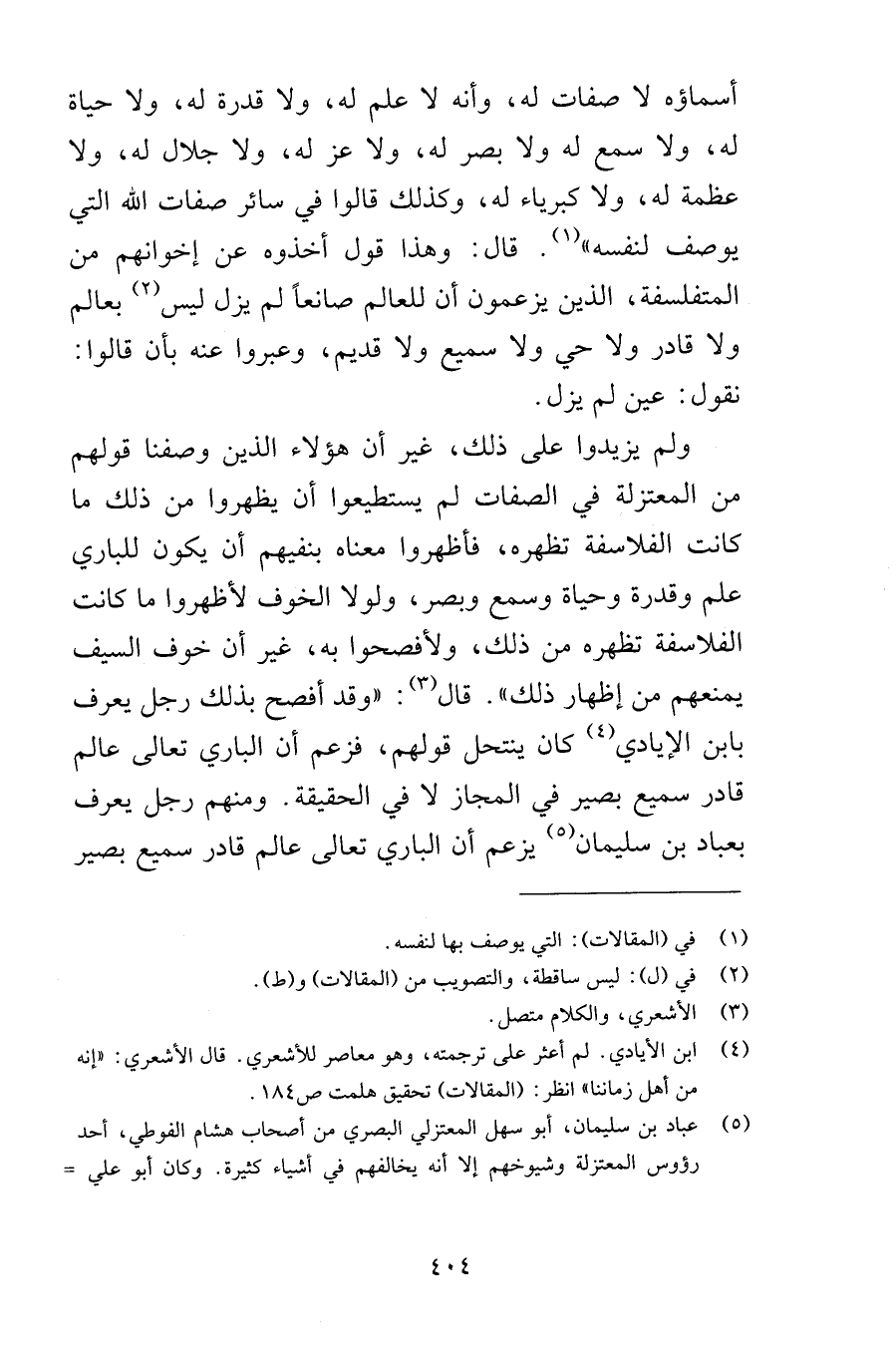 أسماؤه لا صفات له وأنه علم له ولا قدرة له ولا حياة له وسمع له ولا بصر له ولا عز له ولا جلال له ولا عظمة له ولا كبرياء له وكذلك قالوا في سائر صفات الله التي يوصف لنفسه قال وهذا قول أخذوه عن إخوانهم من المتفلسفة الذين يزعمون أن للعالم صانعاً لم يزل ليس بعالم ولا قادر ولا حي ولا سميع ولا قديم وعبروا عنه بأن قالوا نقول عين لم يزل ولم يزيدوا على ذلك غير أن هؤلاء الذين وصفنا قولهم من المعتزلة في الصفات لم يستطيعوا أن يظهروا من ذلك ما كانت الفلاسفة تظهره فأظهروا أن يكون للباري علم وقدرة وحياة وسمع وبصر ولولا الخوف لأظهروا ما كانت الفلاسفة تظهره من ذلك ولأفصحوا به غير أن خوف السيف يمنعهم من إظهار ذلك قال وقد أفصح بذلك رجل يعرف بابن الأيادي كان ينتحل قولهم فزعم أن الباري تعالى عالم قادر سميع بصير في المجاز لا في الحقيقة ومنهم رجل يعرف بعباد بن سليمان يزعم أن الباري تعالى عالم قادر سميع بصير