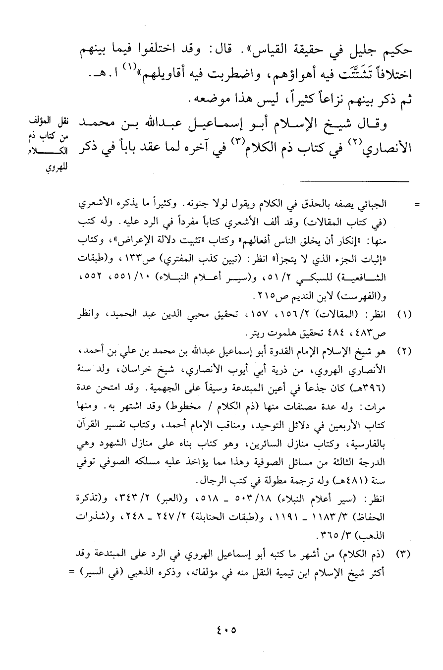 حكيم جليل في حقيقة القياس قال وقد اختلفوا فيما بينهم اختلافاً تَشَتَّتَت فيه أهواؤهم واضطربت فيه أقاويلهم اهـ ثم ذكر بينهم نزاعاً كثيراً يس هذا موضعه وقال شيخ الإسلام أبو إسماعيل عبد الله بن محمد الأنصاري في كتاب ذم الكلام في آخره لما عقد باباً في ذكر